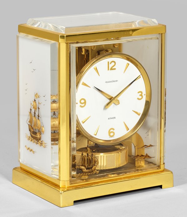sog. "Pendule Perpetuelle". Vergoldetes Messing. Rechteckiger Korpus, mit kräftigen, facettierten, teilw. weiß hinterlegten Plexiglaseinsätzen. In der Front und auf den Seiten Golddekor in Form von Segelschiffen. Weißes Zifferblatt mit goldenen Zahlen und Indexen. Bez. ATMOS Jaeger LeCoultre. Rotationspendel. H. 23 cm. 18 cm x 14 cm. Originalschatulle und Gebrauchsanweisung. Rahmung der Tür fehlt. Front besch.