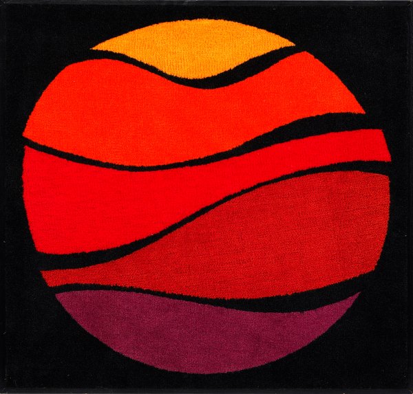 Polyamidgewebe, aufgelegt auf Platte. Auf schwarzem Fond das Kreismotiv zusammengesetzt aus wellenförmigen Segmenten in Orange, Rot und Violett. Verso auf Atelieretikett bez. mit Werknr. 1026, Titel, datiert, Nummer 26/75 sowie sign.; 70 cm x 70 cm. Rahmenleisten.