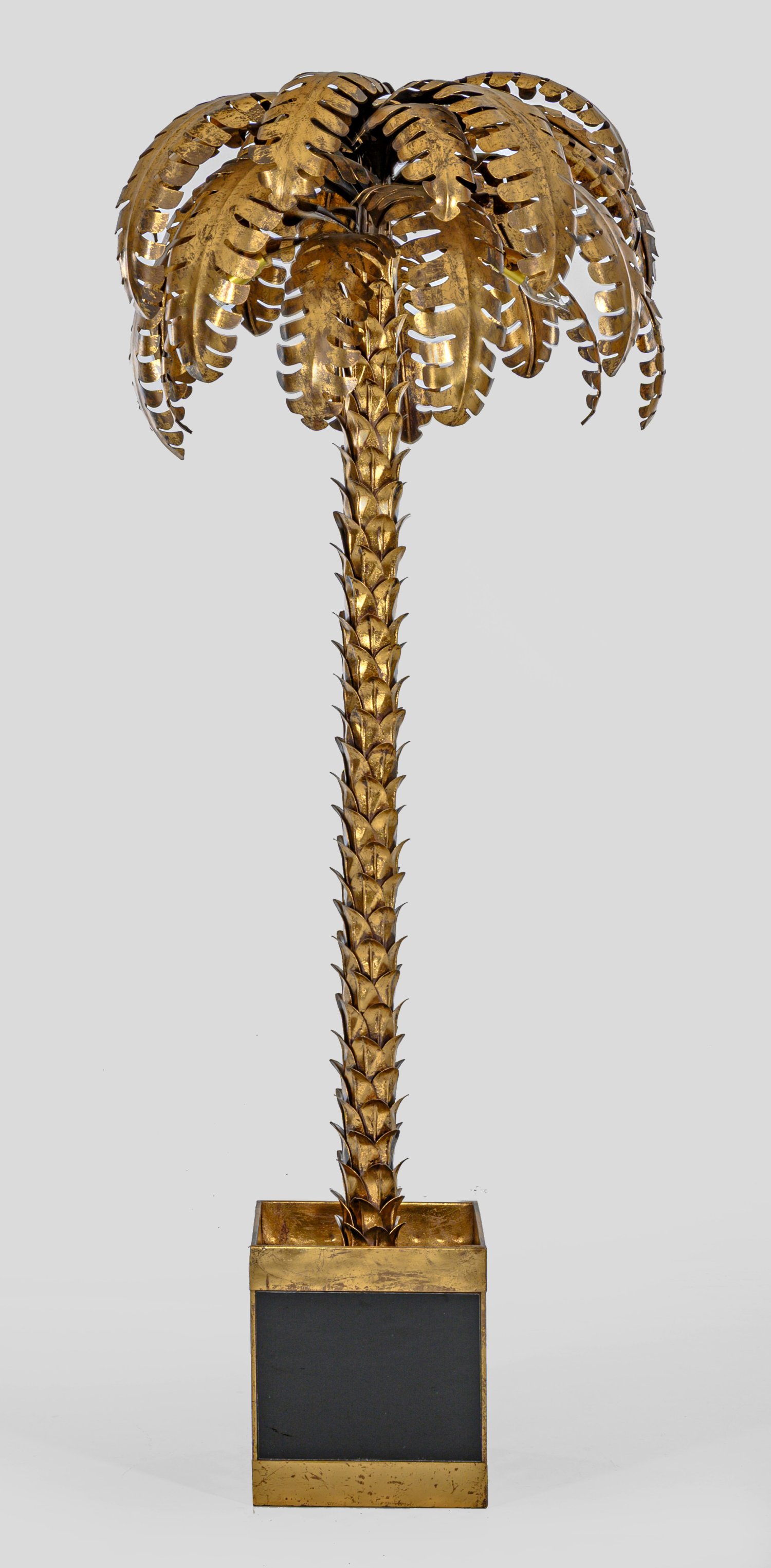 2-flg.; Metall, vergoldet sowie schwarzes Glas. Über gekantetem Sockel naturalistisch gestalteter Korpus in Form einer großen Palme mit stark geschwungenen Palmwedeln als Träger für Leuchtmittel. H. 178 cm.