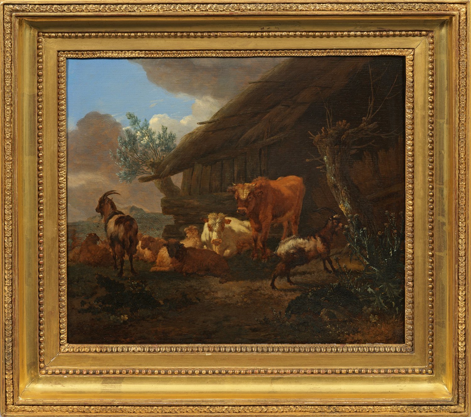 Szene vor einem mit Reet oder Stroh gedeckten Stall, der von zwei Kopfweiden flankiert wird, im Hintergrund ein Berg. Romeyn war auf die Darstellung von Hirten und Vieh spezialisiert, die er meist vor imaginierte italienische Landschaften und römisch-antike Ruinen komponierte. Er gehörte zur zweiten Generation holländischer Italianisanten, beeinflusst von Nicolaes Berchem (1620 - 1683), bei dem er lernte (belegt 1642) und Karel Dujardin. 1646 trat er der Haarlemer Lukasgilde bei. 1650/51 lebte er selbst in Rom, kehrte dann nach Haarlem zurück, wo er in der Malergilde aktiv war. Außer zu Berchem und Dujardin zeigen sich im Oeuvre Romeyns Motiv- und Stilbezüge zu Hendrik Mommers, Adriaen van der Kabel, Willem Buytewech (II) und Dirck Helmbreeker. Öl/Eichenholztafel. Verso alter Klebezettel des 18./19. Jhs. in Französisch: "No. 45 Guill(au)me Romeyn. Paysage qui réprésente un Croupeau de Boeuf & de mouton reposant sur un Paturage devant une Chaumiere", außerdem Bez. mit schwarzer Feder "VAN ROMEYN" u. rotes Wachssiegel mit Monogramm "MB" in Ligatur. 35 cm x 41 cm. Rahmen.