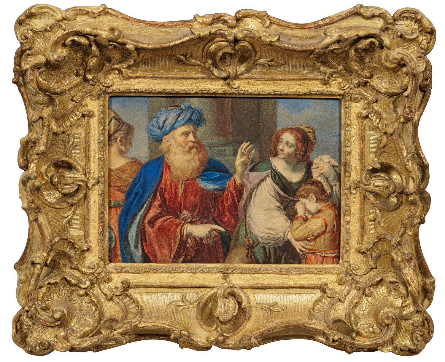 Seitenrichtige, stark verkleinerte Kopie nach dem berühmten, großformatigen Gemälde von Guercino (1591 - 1666), das dieser 1657 ursprünglich im Auftrag Massimiliano III. Stampa (1621-1659), 5. Marchese di Soncino, in Mailand gemalt hatte, der jedoch des Mordes angeklagt und zum Tode verurteilt wurde. Stattdessen wurde es von der Gemeinde von Cento erworben und dem neuen Legaten von Ferrara, Kardinal Lorenzo Imperiali (1612 - 1673) geschenkt. Im 18. Jh. befand sich das Gemälde im Palazzo Sampieri in Bologna, bevor es 1811 es schließlich in die Pinacoteca di Brera nach Mailand gelangte. Isaac Vogelsang lernte bei Jan van Huchtenburg in Amsterdam, wo er ansässig blieb. Da Vogelsangs Karriere in den Niederlanden nicht erfolgreich wurde, suchte er sein Glück in England und ging 1735/36 über Irland und Schottland nach London. Tempera(?)/Papier, auf Karton kaschiert. Mittig an der Säulenbasis sign. u. dat. 1750. 18,5 cm x 24,5 cm. Barock-Rahmen.