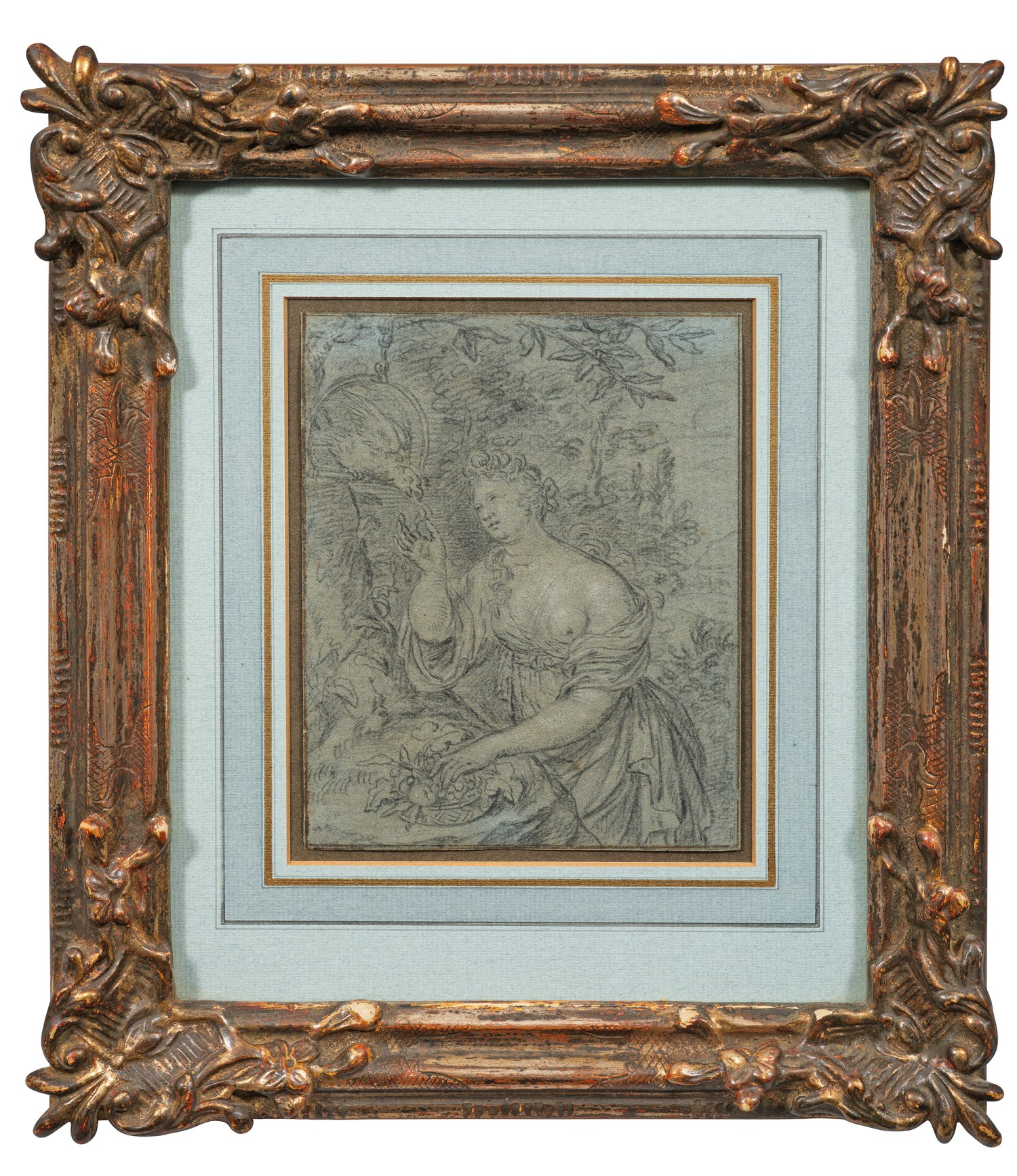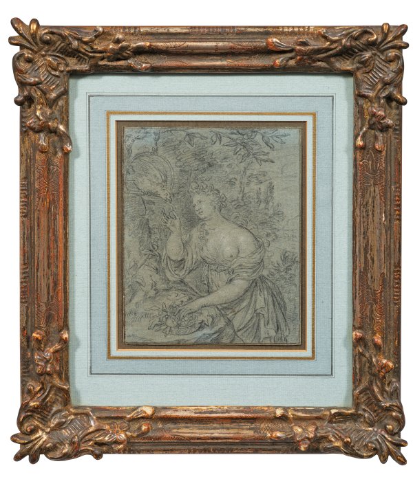 Szenische Darstellung, bei der die Frau den Papagei mit Weintrauben aus einem Früchtekorb füttert, wobei deren sinnlich halbentblößte Brust für den Betrachter zusätzlich bewusst den Eindruck einer Allegorie der Fruchtbarkeit entstehen lässt. Das Thema junger Frauen mit Papageien gehörte zu den besonders beliebten Bildmotiven der niederländischen und auch der Leidener Maler in der 2. Hälfte des 17. Jhs., außer von Franz van Mieris u. a. bei Ary des Vois, Godefridus Schalcken, Gabriel Metsu, Caspar Netscher und Michiel van Musscher. Schwarze u. weiße Kreide/blaugraues Papier. Blatt ca. 15 cm x 11,7 cm. Rahmen.