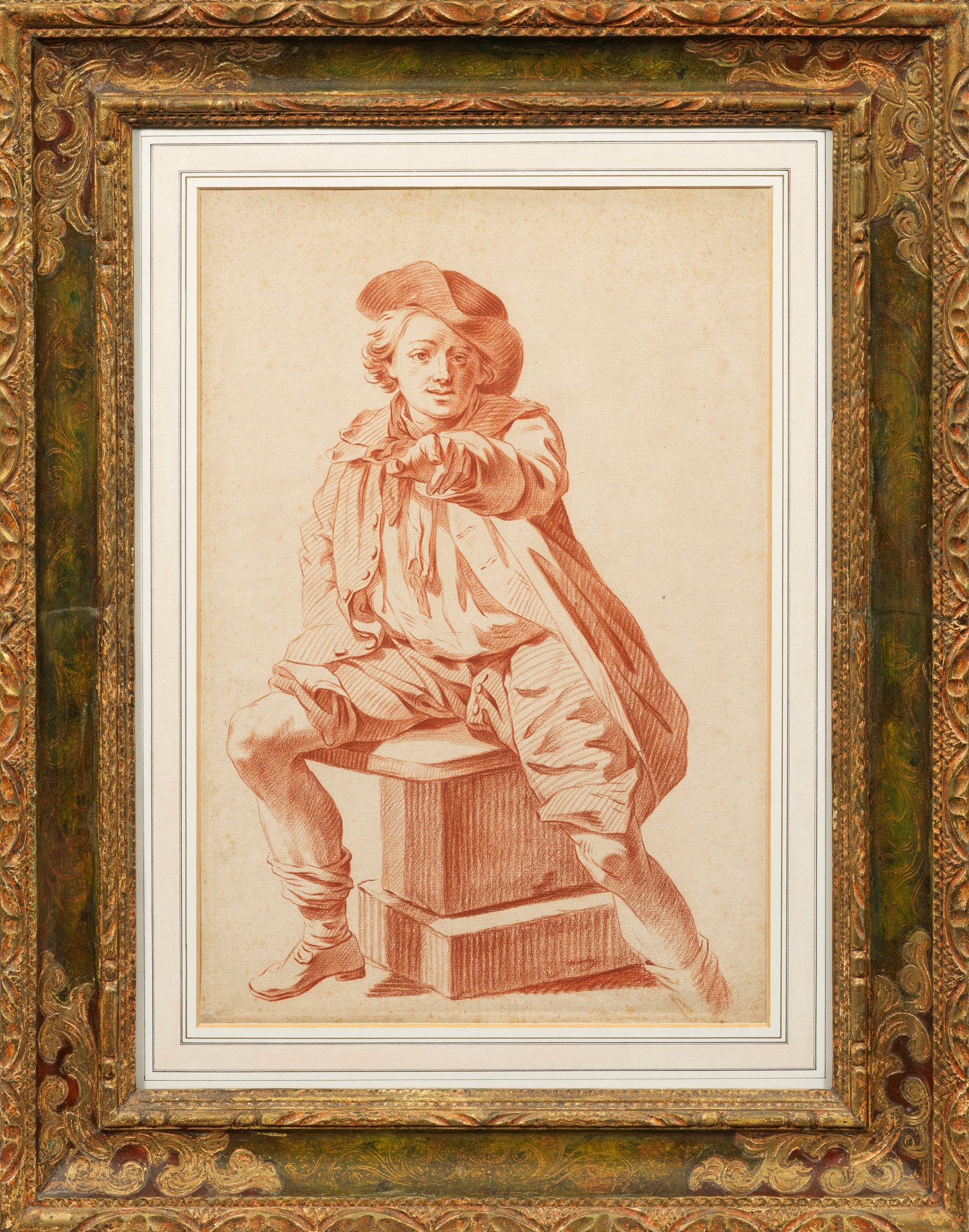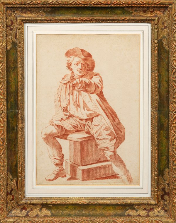 Künstlerisch meisterhafte Zeichnung, deren besondere Qualität in der Direktheit und in der Unmittelbarkeit der Situation liegt: der Jüngling wird in legerer Pose, höchst lebendig mit heruntergerutschten Strümpfen geschildert, wie er diagonal auf der Ecke eines kleinen Steinsockel sitzt und durch seine Haltung, Gestik und Mimik Zwiesprache mit dem Künstler und damit auch uns als Betrachter hält. Rötel/Paper. Ca. 44,5 cm x 29,5 cm (Passepartoutausschnitt). Rahmen.