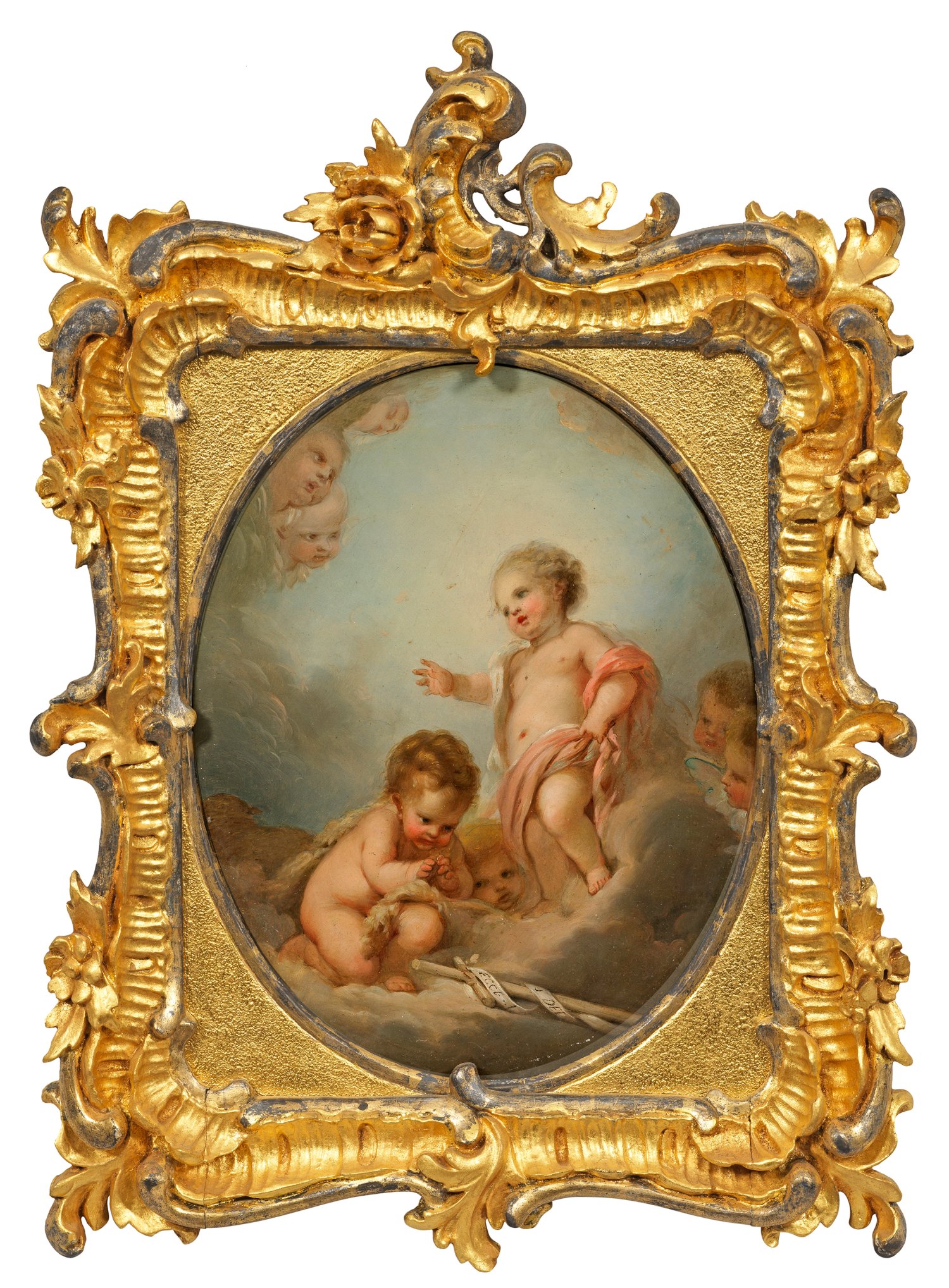 Auf einer Wolke stehend hält der Jesusknabe seine Hand segnend über das Haupt Johannes des Täufers als Knabe, der unterhalb in betender Haltung kniet und lediglich mit einem Fell bekleidet ist. Begleitet werden die beiden von zahlreichen Cherubinen. Am unteren Bildrand ein Stab mit dem Spruchband "Ecce Agnus Dei". Feinmalerisches, in fein nuanciertem, pastelltonigem Kolorit ausgeführtes Werk aus dem ausgehenden 18. bzw. frühen 19. Jh. in der Stilnachfolge von François Boucher. Öl/Karton oder Platte. Verso mit undeutlicher Beschriftung. 21 cm x 16,5 cm (Sichtmaß). Rahmen.