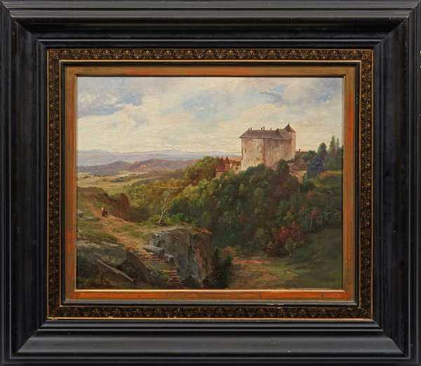Stimmungsvoll inszenierte, weitläufige Landschaft, die den Blick links auf ein malerisches Steinplateau mit Personen freigibt, dahinter eine prächtige Burganlage auf einer höher gelegenen, dicht bewaldeten Anhöhe. Feinmalerische, durch eine effektvolle Lichtstimmung bestimmte Landschaft Obermüllners, der in Wien und München ausgebildet wurde. Öl/Mahagonitafel. L. u. sign.; 35,8 cm x 45,2 cm. Rahmen.