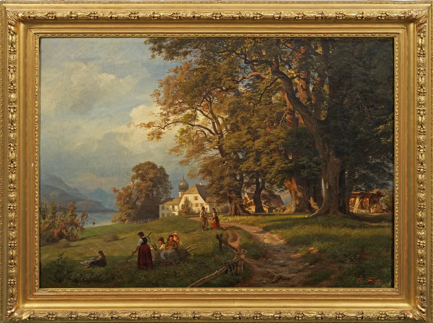 Landschaft mit Kirchdorf an einem See und rastender Bauernfamilie nach der Mahd