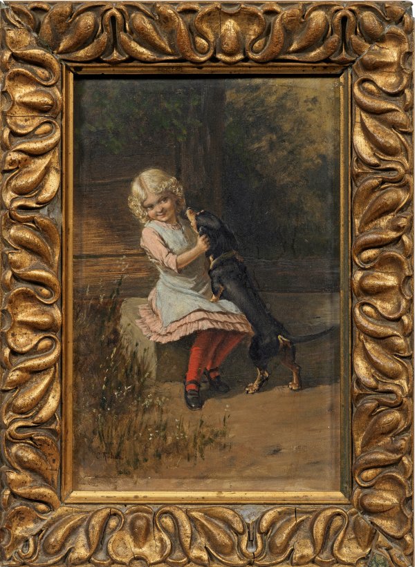Auf einer Steinbank an einer Holzhütte spielt ein blondes Mädchen mit ihrem Dackel, der freudig an ihr hochspringt. Einfühlsam geschilderte, feinflüssig gemalte Genreszene Rohdes, der an der Kunstschule in Stuttgart bei B. Neher und H. Rustige ausgebildet wurde und ab 1864 in München, ab 1889 in Berlin tätig war. Öl/Mahagonitafel. L. u. sign.; 27 cm x 17,5 cm. Rahmen.