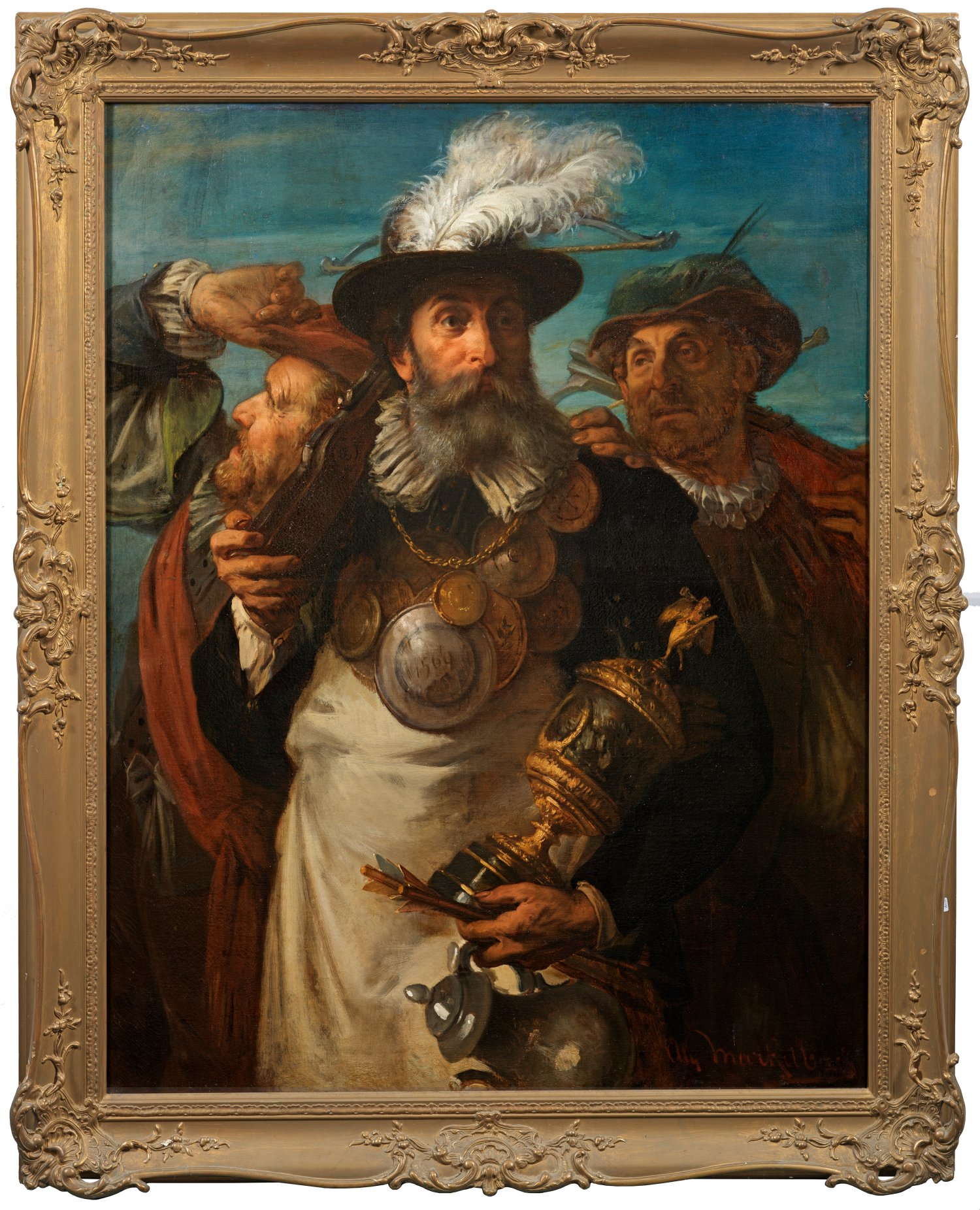 Großformatiges Werk Markelbachs, der anfänglich historisierender Genreszenen malte. Er studierte an der Kgl. Kunstakademie in Antwerpen bei Philippe Jacques van Bree und 1845-1848 in München bei Wilhelm Kaulbach. Danach kehrte er nach Antwerpen zurück, bevor er sich 1858 in Brüssel niederließ und seitdem vornehmlich religiöse Motive malte. 1889 wurde Markelbach ordentliches Mitglied der Königlichen Akademie von Belgien. Öl/Lwd.; R. u. sign.; 133 cm x 106,5 cm. Rahmen.