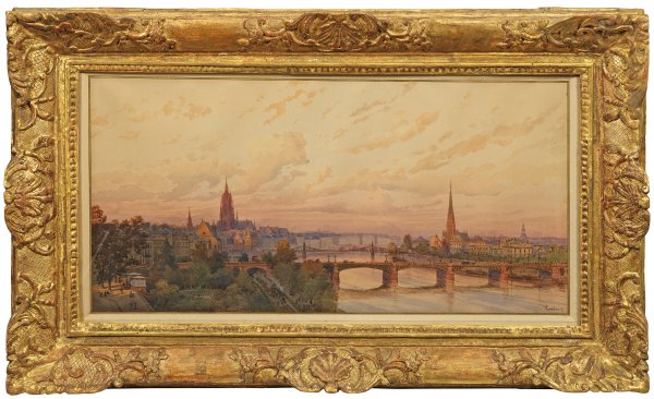 Reizvolle, topografisch genau geschilderte Panoramaansicht der hessischen Metropole mit Mainblick. Links der Kaiserdom St. Bartholomäus, rechts die Dreikönigskirche und die Deutschordenskirche in Sachsenhausen. Aquarell/Papier. R. u. sign. "WGanter"(?) und dat. (18)91. Ca. 34 cm x 70 cm (Sichtmaß). Rahmen.