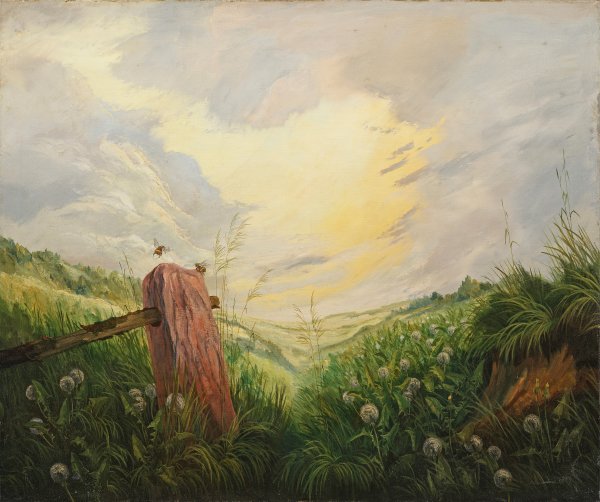 Idyllische, realistische Landschaft Kunzes, der seine künstlerische Ausbildung an der Kunstgewerbeschule und Akademie in Leipzig erhielt. Seit 1904 war Kunze als freischaffender Maler in Sebnitz tätig. 1938-1943 beschickte er die "Großen Deutschen Kunstaustellungen" in München, wo er 1940 die "Blühende Wiese am Chiemsee" zeigte. Öl/Lwd.; L. u. sign. u. dat. (19)42. 88 cm x 105 cm.