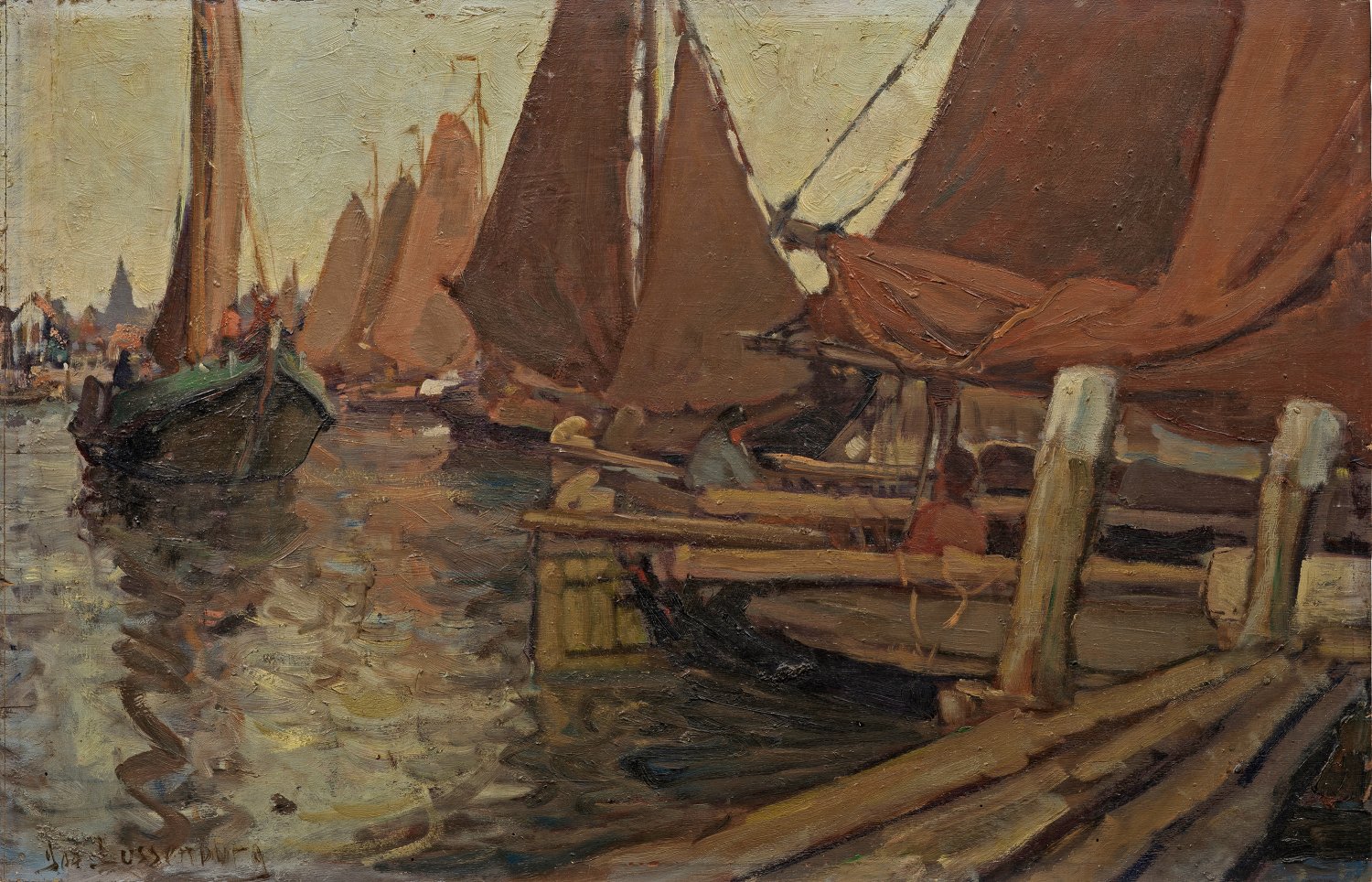 Mit breitem, lockerem, weich pastosem Duktus gemaltes Werk des Künstlers, beeinflusst durch die Haager Schule. Lussenburg widmete sich vornehmlich Küsten- und Marinebildern, insbesondere Hafenorten mit Fischerbooten an der Nordsee und der Zuderzee (heute Ijsselmeer), an der auch Nunspeet lag. Öl/Sperrholztafel. L. u. sign.; 54,7 cm x 85 cm.