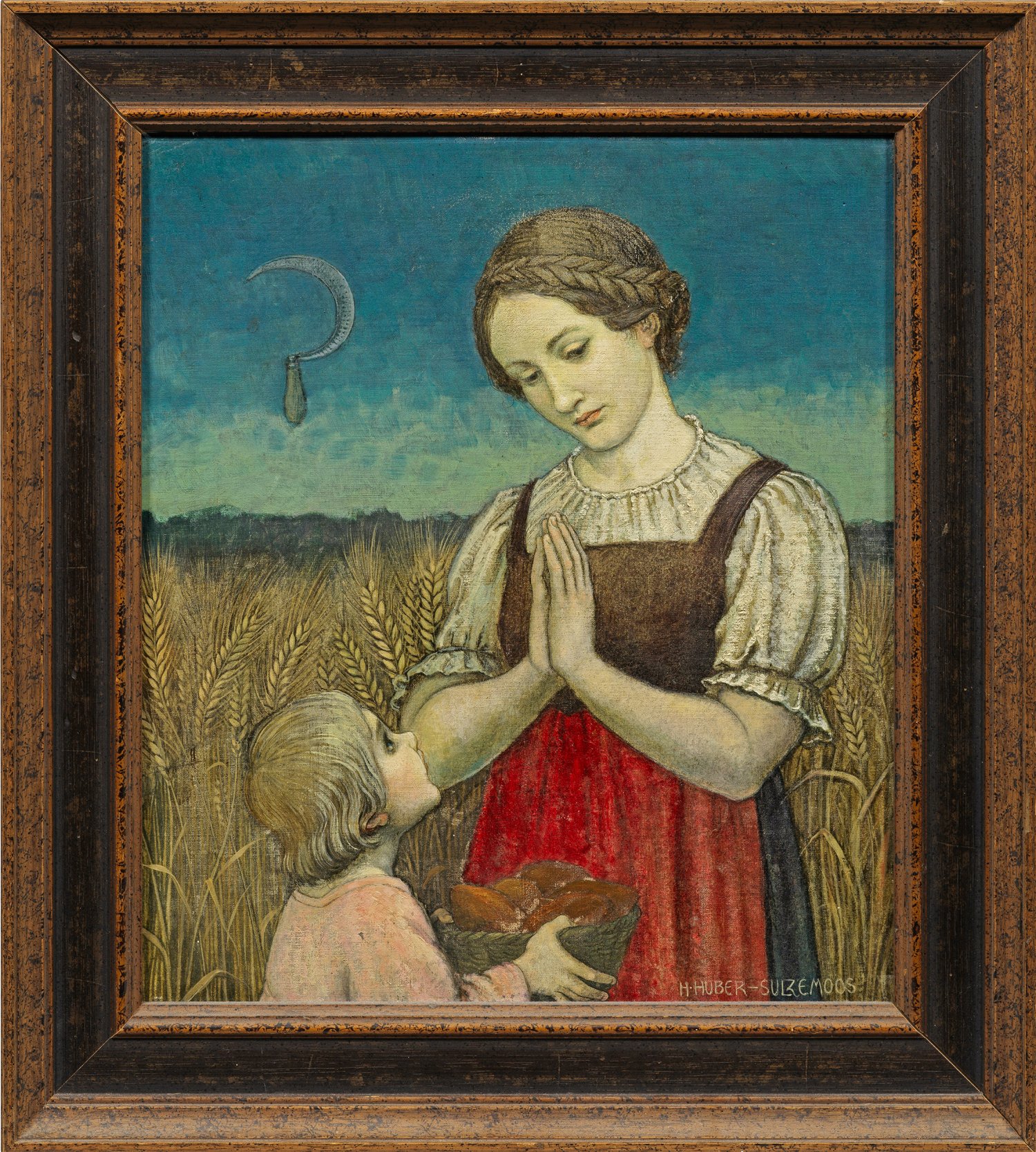 Feinfühlig charakterisierte Darstellung der Heiligen Notburga von Rattenberg, einer Tiroler Volksheiligen, die als Patronin der Dienstmärgde und der Landwirtschaft gilt und zumeist mit einer Sichel dargestellt wird. Stil- und motivtypisches Werk Huber-Sulzemoos, der an der Akademie in München lernte und vornehmlich christliche Themen aufgriff. Öl/Lwd., kaschiert auf Karton. R. u. sign.; Verso bez. mit Titel, Dat. 1924 und Atelieradresse in München. Ca. 40 cm x 35 cm. Rahmen.