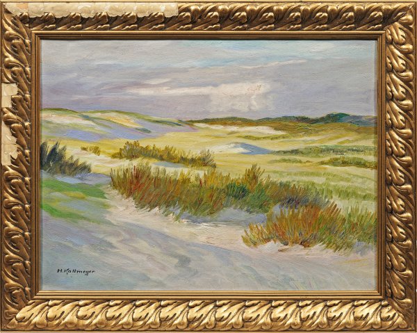 In reizvollem Licht- und Schattenspiel und fein nuancierter, pastelltoniger Palette geschilderte Impression Kallmeyers, der an der Akademie in Dresden bei Richard Müller und Emanuel Hegenbarth lernte und ein Atelier in Nidden betrieb. Öl/Lwd.; L. u. sign. Verso undeutlich bez.; 45,5 cm x 60,5 cm. Rahmen.