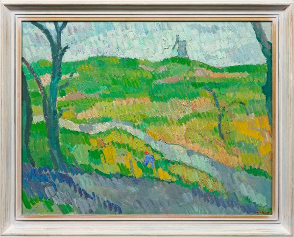 In leuchtenden Farben und breiten, pastosen Pinselstrichen gemalte Landschaftsimpression mit Windmühle. Charakteristisches, neoimpressionistisches Werk des dänischen Künstlers Carstensen, der an der Akademie in Kopenhagen bei A. Jörgensen studierte. Öl/Lwd.; R. u. sign.; Verso sign., dat. (19)95 und betitelt. 58 cm x 72 cm. Rahmen.