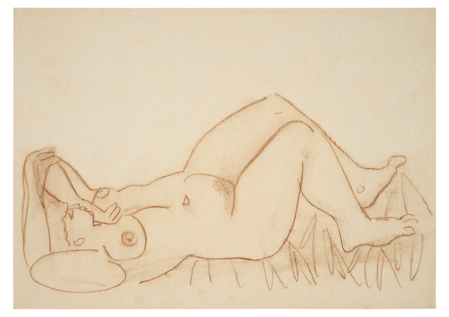 Gekonnt flüchtig und schwungvoll skizzierte weibliche Aktdarstellungen (auf Vorder- und Rückseite). Frank lernte u. a. bei Carl Hofer an der Berliner Akademie und zählt zu den Künstlern der sog. "Verschollenen Generation". Braune Kreide/chamoisfarbenes Papier. Auf einer Seite r. u. sign.; 43,2 cm x 60,5 cm.