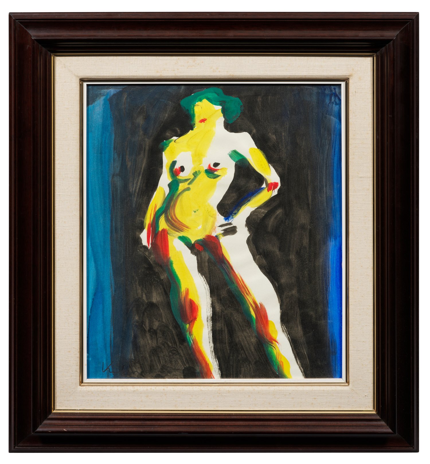 Wohl um 1990 geschaffenes, in breiten, schwungvollen Strichen angelegtes Blatt Kornbergers, der vor allem durch seine expressiven Aktbilder bekannt ist. Der bedeutende österreichische Künstler studierte Malerei bei Robin Christian Andersen an der Akademie in Wien und setzte sich im Laufe seiner Künstlerkarriere mit den unterschiedlichen Facetten der Klassischen Moderne auseinander, die auch Picassos Spätwerk und die Wiener Kunst des 20. Jhs. von Egon Schiele bis Alfred Hrdlicka umfasst. Aquarell/Papier. L. u. sign.; 61,3 cm x 49,8 cm. Rahmen.