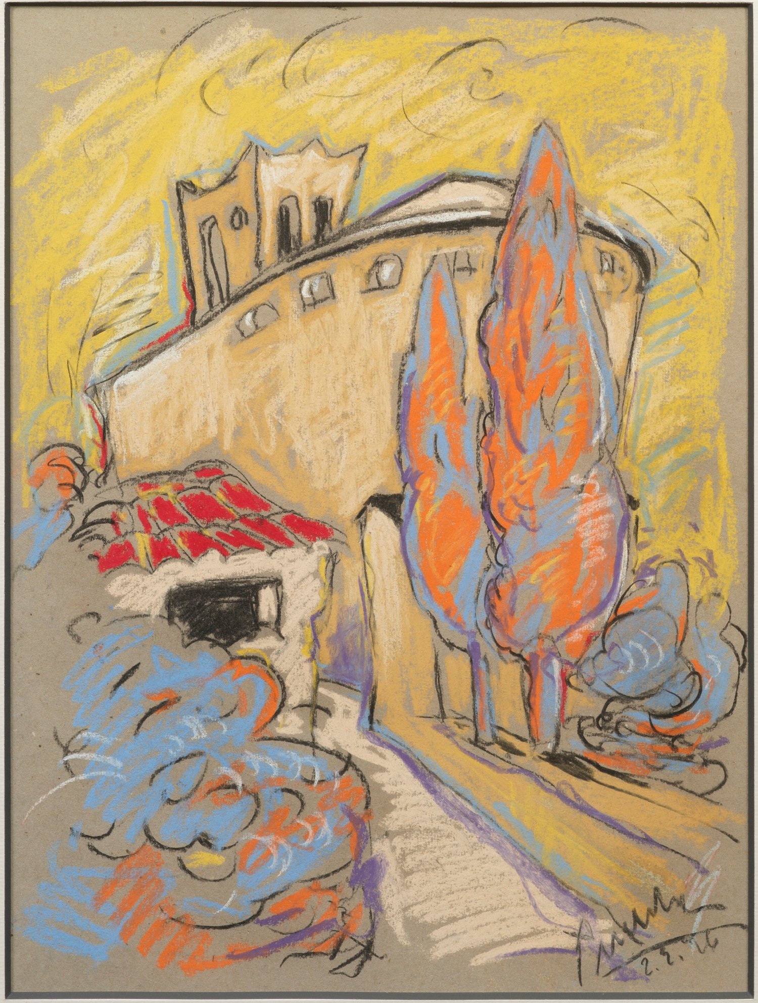 Von der französischen Moderne und dem Post-Impressionismus eines Vincent van Gogh oder Paul Cézanne inspiriertes Werk, das die Atmosphäre, das Licht und die belebende Energie des Mittelmeerraums zum Ausdruck bringt. Pastell- oder Farbkreiden/hellgraues Papier. R. u. sign. u. dat. 2.9.(19)96. Ca. 48,5 cm x 34 cm (Passepartoutausschnitt). Rahmen.