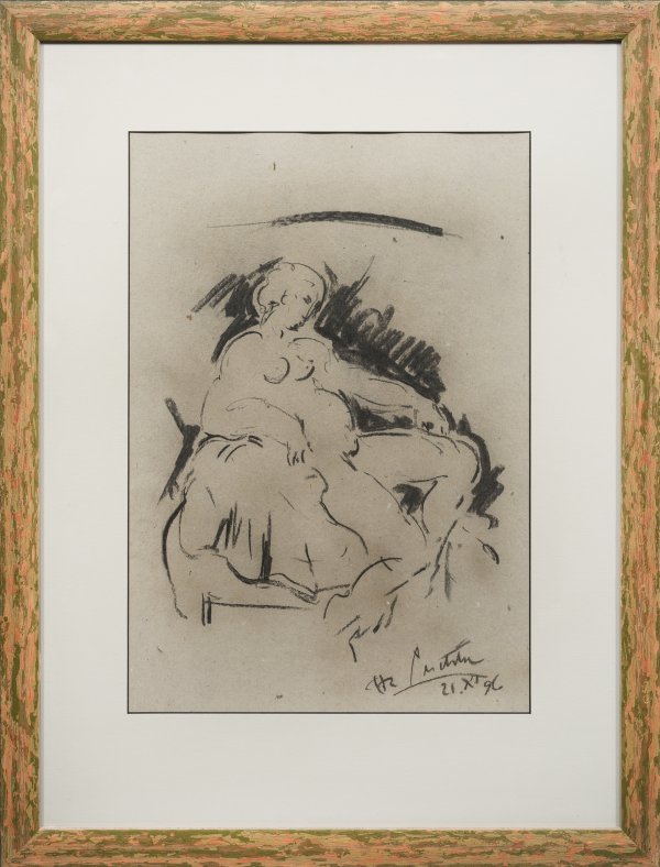 Black chalk (or charcoal) on light grey paper. Signed and dated (19)96.