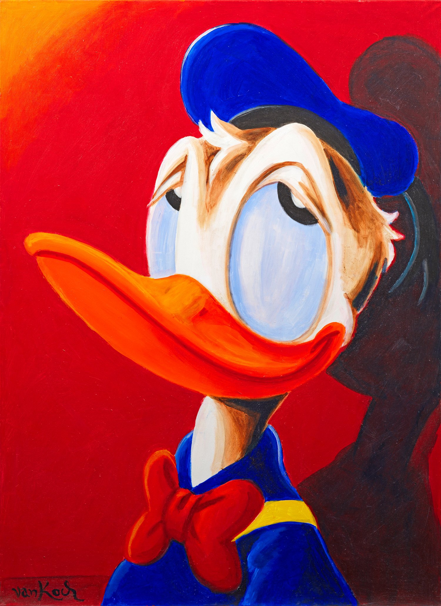 Neo-Pop Art-Gemälde des Künstlers, der durch seine im Stil des Donald-Duck-Zeichners Carl Barks ausgeführten Arbeiten mit Motiven der berühmten Comic-Ente und anderer Figuren der Comic-Reihe bekannt wurde. Durch seinen Künstlernamen spielte er ironisch auf Vincent van Gogh an. Öl oder Acryl/Lwd.; L. u. sign.; 140 cm x 100 cm.