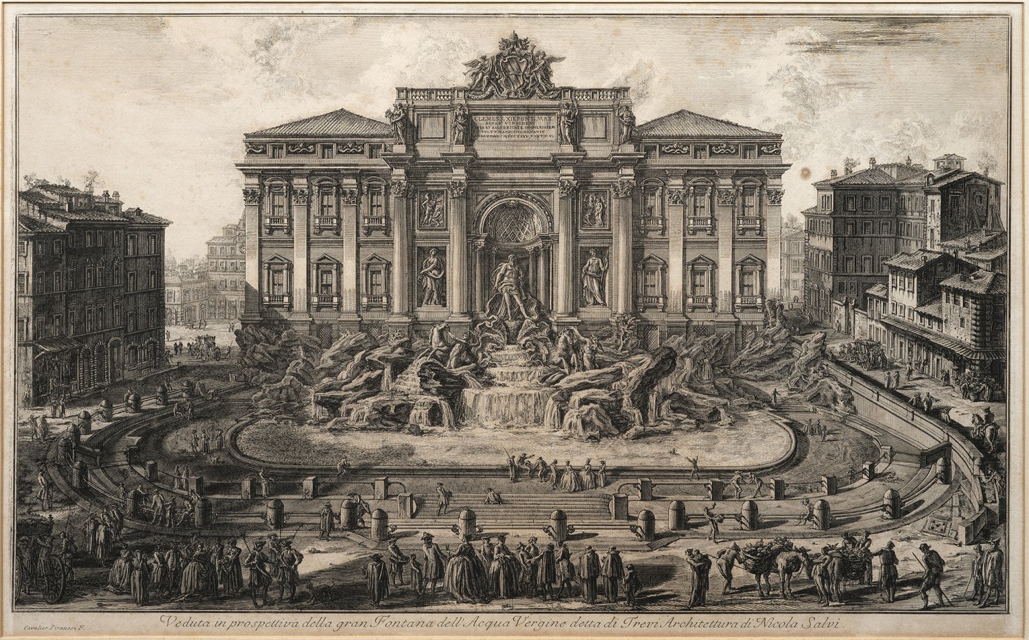 Radierung/Bütten, 1773. Unterhalb bez. "Cavalier Piranesi F." sowie mit Titel. Aus der Folge "Vedute die Roma". Subtil geschilderte, reich belebte Ansicht des monumentalen Brunnens auf der Piazza die Trevi in Rom, geschaffen von dem Architekten Nicola Salvi für Papst Clemens XII. Wvz. Hind 104. Darstellung 46 cm x 71,5 cm. Rahmen.