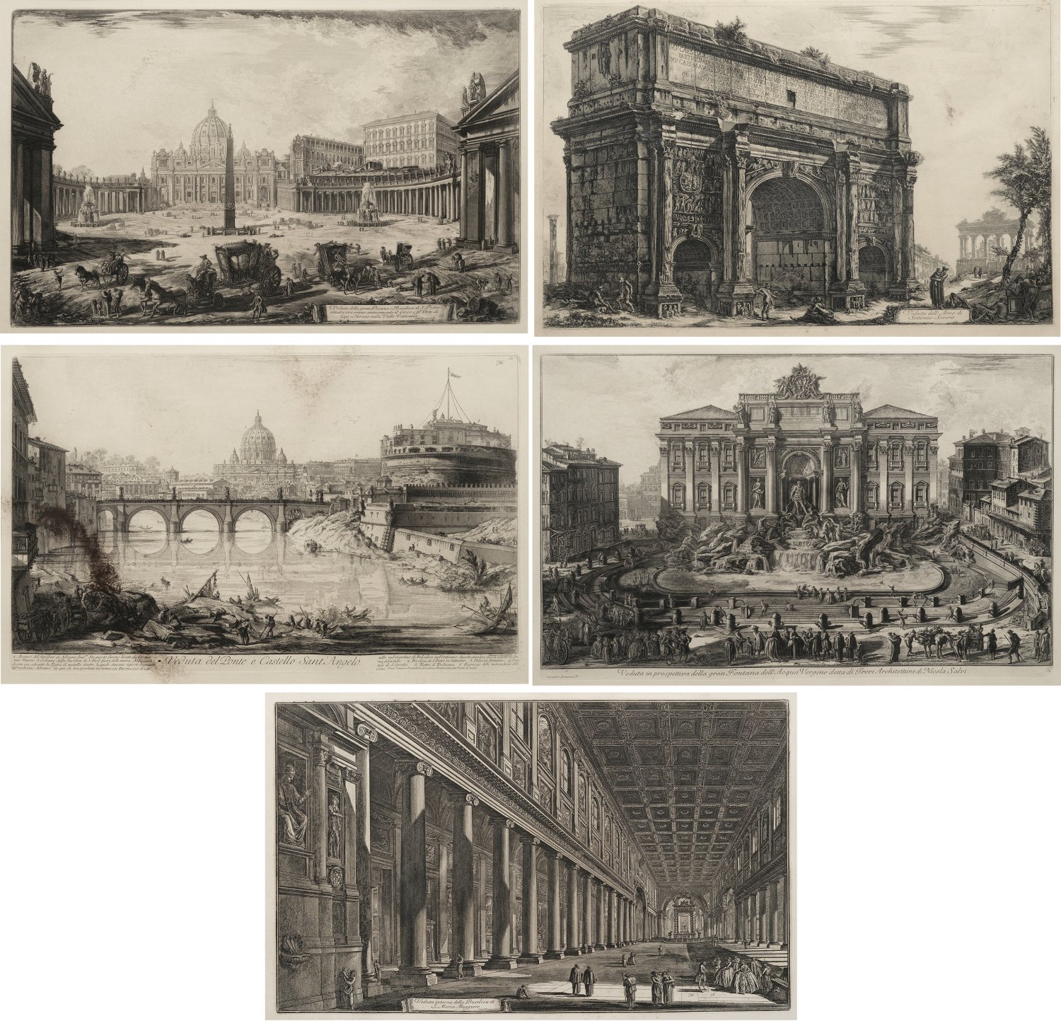 Radierungen/Velin. Spätere Abzüge aus dem Radierzyklus "Vedute die Roma" für die Pariser Ausgabe, erschienen bei Firmin Didot, um 1835. Die Erstausgabe erfolgte in Einzelblättern Ende 1747 - 1778, zunächst herausgegeben von Giovanni Bouchard, ab 1760 vom eigenen Verlag. Dabei: "Veduta in prospettiva della gran Fontana dell'Acqua Vergine detta di Trevi [...]" (Tafel 34, Wvz. Focillon 734), "Veduta della gran Piazza e Basilica di S. Pietro [...]" (Tafel 4, Focillon 721), "Veduta del Ponte e Castello Sant'Angelo" (Tafel 52, Wvz. Focillon 793), "Veduta dell'Arco di Settimio Severo" (Tafel 20, Wvz. Focillon 754), "Veduta interna della basilica di S. Maria Maggiore" (Tafel 16, Wvz. Focillon 728). Teilweise mit Trockenstempel "Regia Calcografia di Roma" (Lugt 2144). Plattenmaße ca. 37,5-47,5 cm x 58,1-71,2 cm. Rahmen.