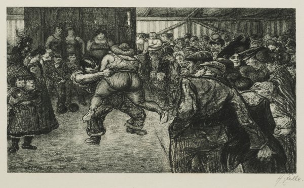 Heliogravüre in Braunschwarz/gewalztes China auf Kupfertiefdruckkarton, 1903/1909. R. u. sign.; In der Platte sign. und dat. (19)03 sowie r. u. mit Blattnummer 3. Nach einer Zeichnung aus dem Jahr 1903, erschienen in einer Auflage von ca. 100 Exempl. in: Heinrich Zille, Zwölf Künstlerdrucke, Moritz Lilienthal Verlag, Berlin 1909. Wvz. Rosenbach 33 b. Platte 18 cm x 24,1 cm. Rahmen.