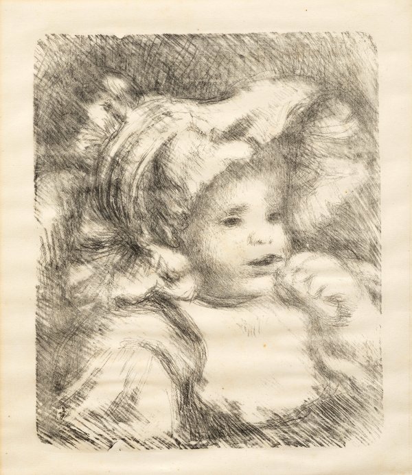 Lithographie/Bütten, um 1898/99. Seltener Künstler-Abzug vor der farbigen Auflage (von 100), gedruckt von Auguste Clot, Paris. Wvz. Delteil/Stella 31. Liebevoll stellt Auguste Renoir hier seinen kleinen Sohn Jean Renoir (1894 - 1979) dar, der später als Schauspieler und Filmregisseur bekannt wurde. Leicht gewellt, lichtrandig. Darstellung ca. 31,5 cm x 26 cm. Rahmen.