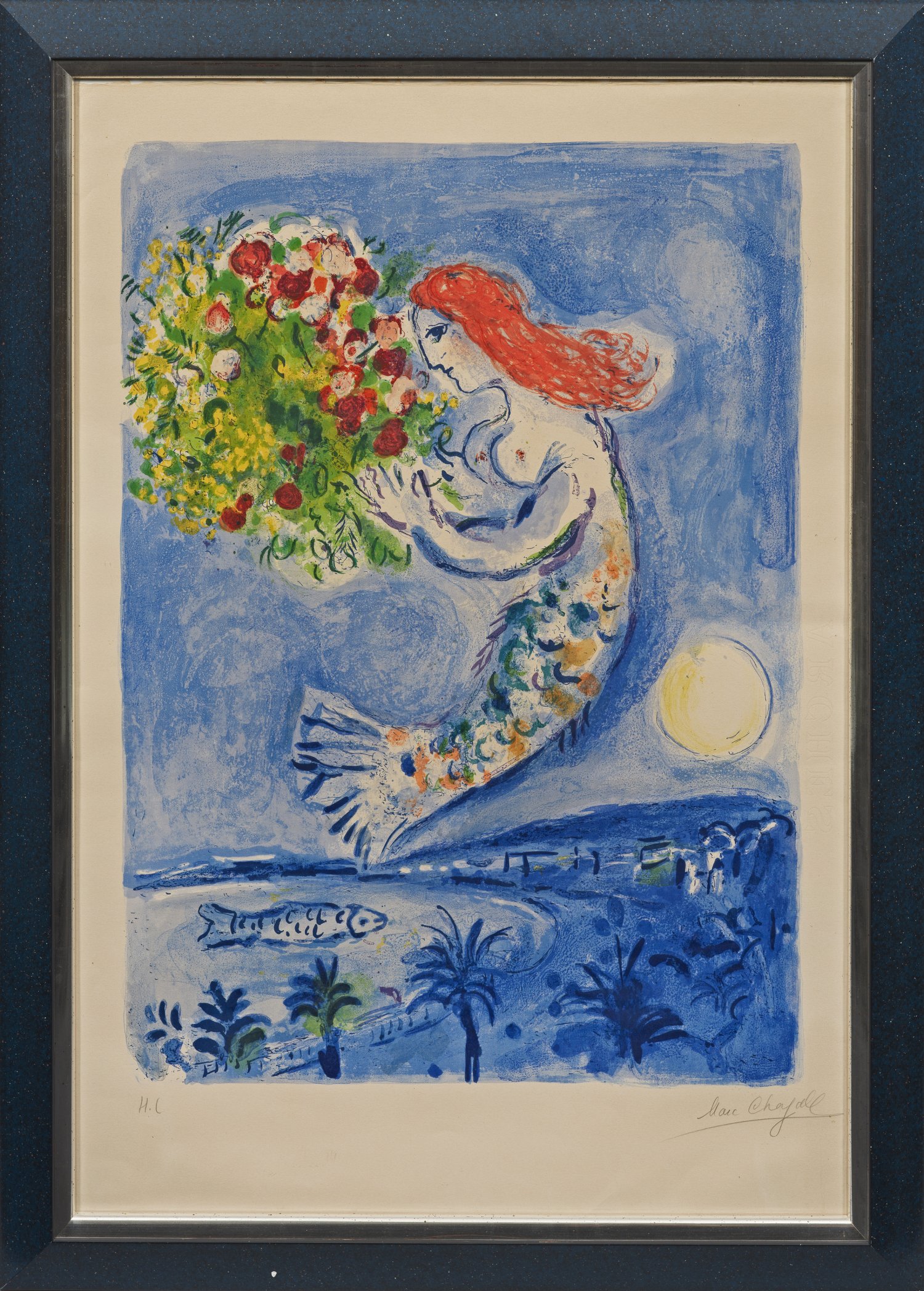 Farblithographie/Arches-Velin (mit Wasserzeichen), 1961/62. Sign. u. bez. "H.C". Gedruckt von Mourlot, Paris. Eines der seltenen "HC"-Exemplare dieses bedeutenden, prachtvollen Blattes außerhalb der Auflage von 50 arabisch nummerierten Exemplaren und 25 römisch nummerierten Künstlerexemplaren auf breitrandigem Velin. Wvz. Mourlot 350. Die Farblithographie ist exemplarisch für Chagalls poetische Bilderwelten mit ihrer fantasievoll-verträumten, märchenhaften Leichtigkeit, die er besonders nach 1945 entwickelte. Es ist zugleich eine Liebeserklärung an seine zweite Heimat Frankreich, wo der aus Russland stammende jüdische Künstler die meiste Zeit lebte und arbeitete, insbesondere auch die Côte d’Azur - nachdem Chagall 1949 nach Saint-Jean-Cap-Ferrat bei Nizza gezogen war. Chagall lässt in dieser Farblithographie eine Meerjungfrau mit rotem Haar und großem Blumenstrauß am blauen Himmel schweben, die ihrem eigentlichen Element entstiegen ist, unter ihr das Meer mit überdimensionalem Fisch und die titelgebende "Baie des Anges" (Bucht der Engel) mit der "Promenade des Anglais" (Promenade der Engländer) in Nizza. Chagall schuf diese Farblithographie mit der für ihn so überaus charakteristischen Darstellung ursprünglich als Werbeplakat für die Auslandswerbung für das Kommissariat des französischen Fremdenverkehrs für Nizza und die Côte d'Azur. Jenes Plakat erschien in einer unsignierten Auflage (von 5000 Exemplaren) mit erläuterndem Text "NICE Soleil (/) Fleurs", herausgegeben vom französischen Verkehrsbüro. Darstellung ca. 78,1 cm x 57,2 cm; Blatt ca. 95 cm x 65,8 cm. Rahmen.
