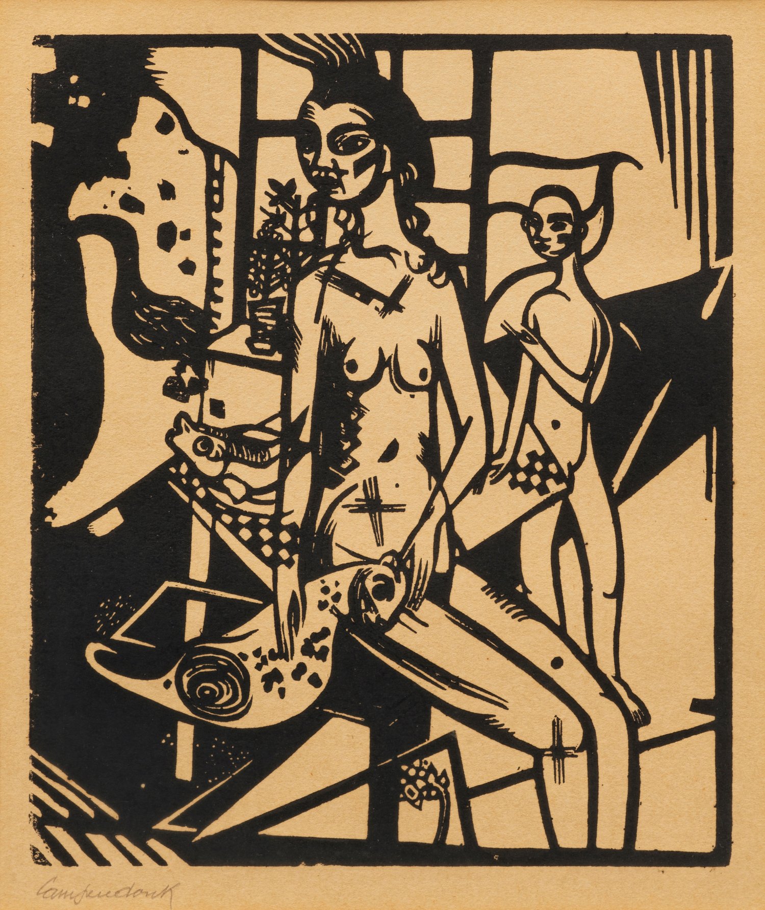 1912 wurde Heinrich Campendonk Mitglied des Blauen Reiter in München, an deren Ausstellung er sich schon 1911 beteiligt hatte. Seine Mitstreiter waren Wassily Kandinsky, Franz Marc, Gabriele Münter, Paul Klee, August Macke und Alexej von Jawlensky. Campendonks Oeuvre ist bestimmt von märchenhaften, poetischen Szenen, wie in diesem Holzschnitt, in dem ein weiblicher Akt ein seepferdchenartiges Tier hält.