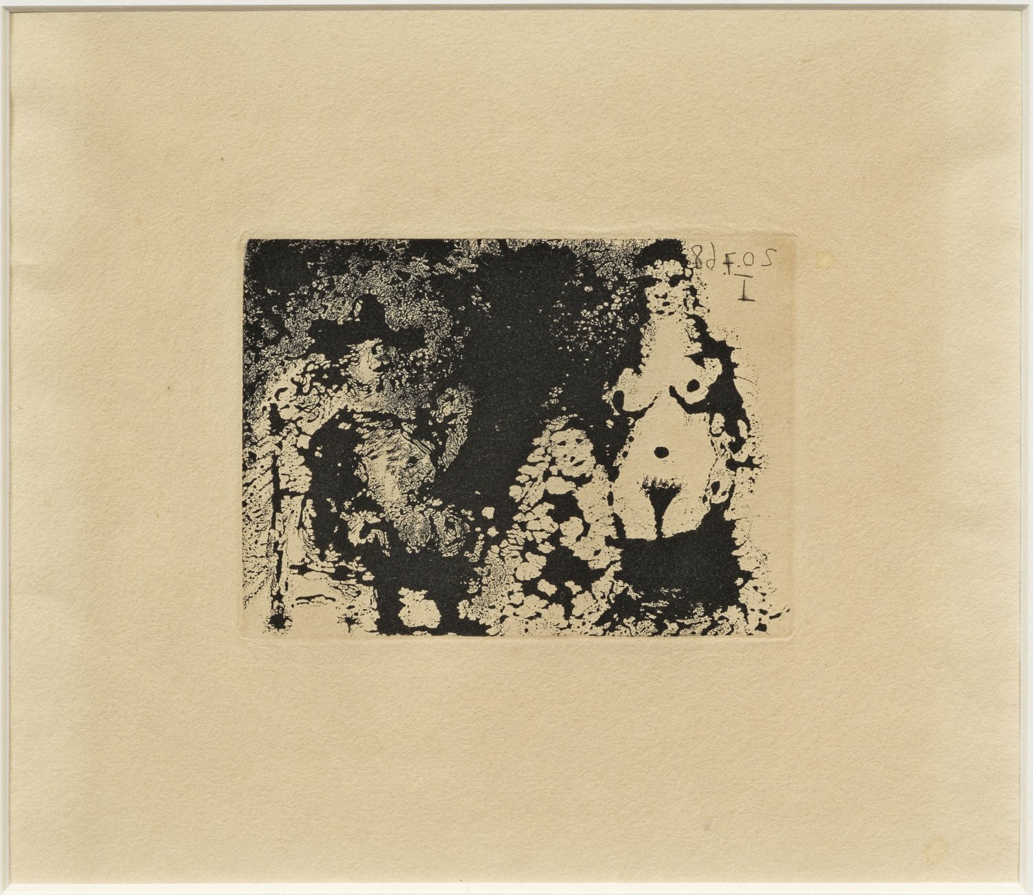 Aquatinta-Radierung/Richard le Bas-Bütten, 1968. In Der Platte spiegelbildlich dat. "20.07.(19)68)" u. römisch nummeriert "I". Eins von 400 unsignierten und unnummerierten Exemplaren des Portfolios bzw. der Buchausgabe "La Célestine" als Blatt 209 der legendären "347 Suite" /"347 Series"), gedruckt von Aldo and Piero Crommelynck, Mougins, erschienen 1971 in der Éditions de l'Atelier Crommelynck, Paris. Die von Picasso signierte und nummerierte Edition auf Vélin de Rives war zuvor in einer Auflage von 50 Exemplaren erschienen, herausgegeben von der Galerie Louise Leiris, Paris 1969. Wvz. Cramer 149, Bloch 1690, Geiser-Baer VI, 1705; Orozco 2809/10. Leicht gebräunt. Plattenmaß 6 cm x 8,5 cm. Rahmen.