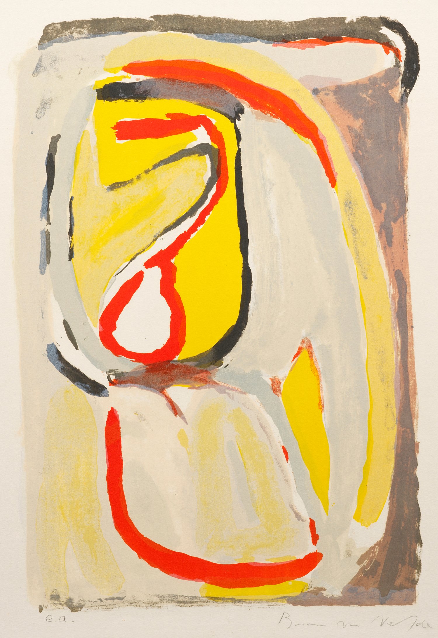 Farblithographie/Velin, 1969. Sign. u. bez. "e. a.". Künstler-Exemplar außerhalb der Auflage von 300. Wvz. Rivière 54. Expressives Blatt des niederländischen, größtenteils in Frankreich tätigen Künstlers, der 1964 er an der documenta 3 in Kassel teilnahm. Breite Blattränder mit dreifach sichtbarem Schöpfrand. Schwach gebräunt, sonst insgesamt in sehr gutem Zustand. Rahmen. Darstellung ca. 56 cm x 37,5 cm; Blatt ca. 65,5 cm x 47,5 cm.