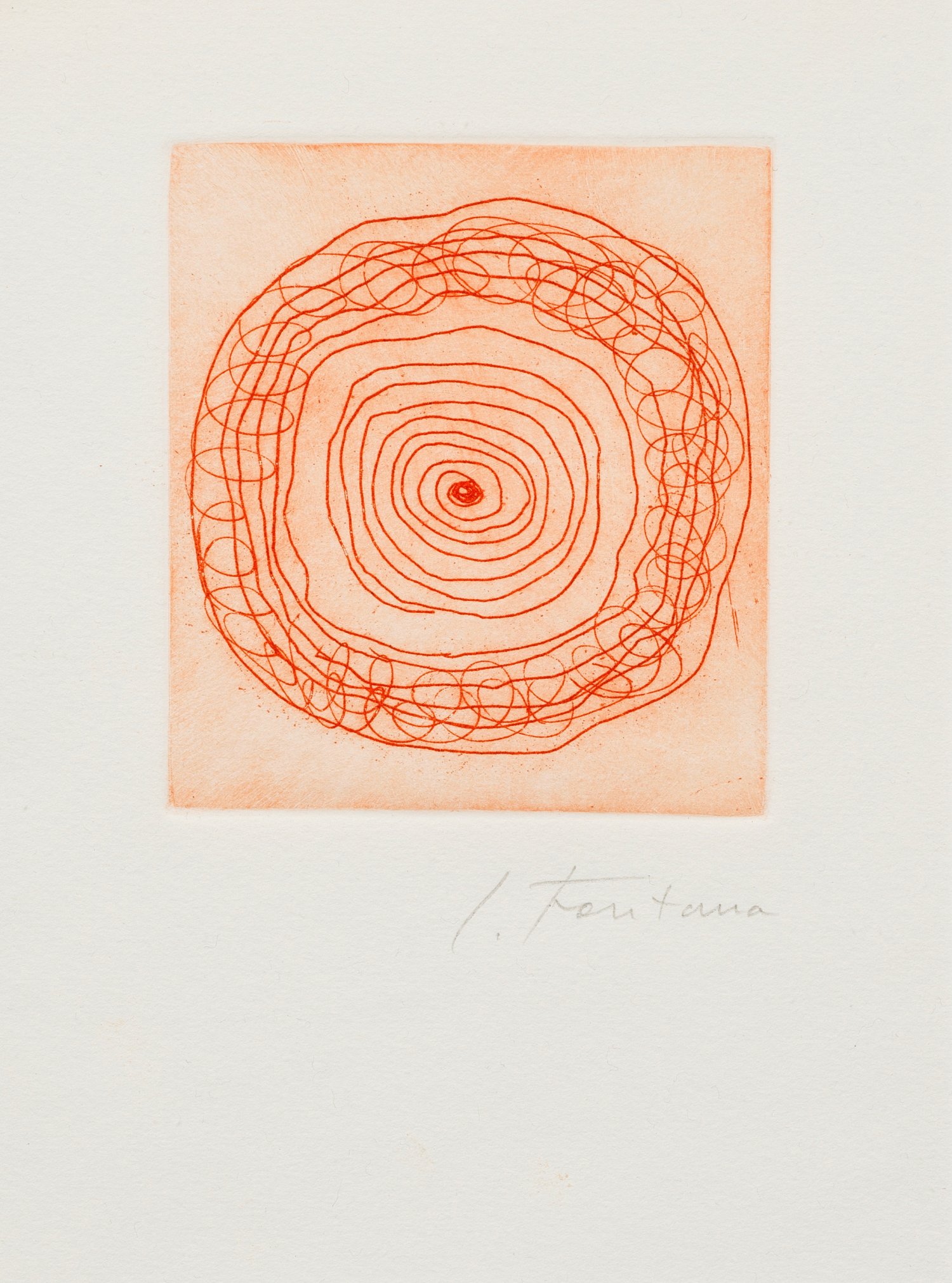 Farbaquatinta in Rot/Velin, 1966. Sign.; Eins von 100 Exemplaren (Gesamtauflage 110) als Beigabe zum 1966 erschienenen Künstlerbuch "L'eredità di Dante" von Luigi Cavallo, das in einer Auflage von 400 Exemplaren bei Giorgio Upiglio in Mailand erschien (arabisch nummeriert im Impressum von 1 bis 400; plus 40 Exemplaren, römisch nummeriert von I bis XL). Den Nummern 101 bis 200 lagen zwei Radierungen von Lucio Fontana bei. Beim vorliegenden Expl. handelt es sich um Nr. 160 (siehe montierte Fotokopie des Buch-Impressums verso auf dem Rückenkarton). Wvz. Ruhé u. Rigo E-34. Plattenmaß (Darstellung) ca. 9 cm x 8,7 cm. Rahmen.