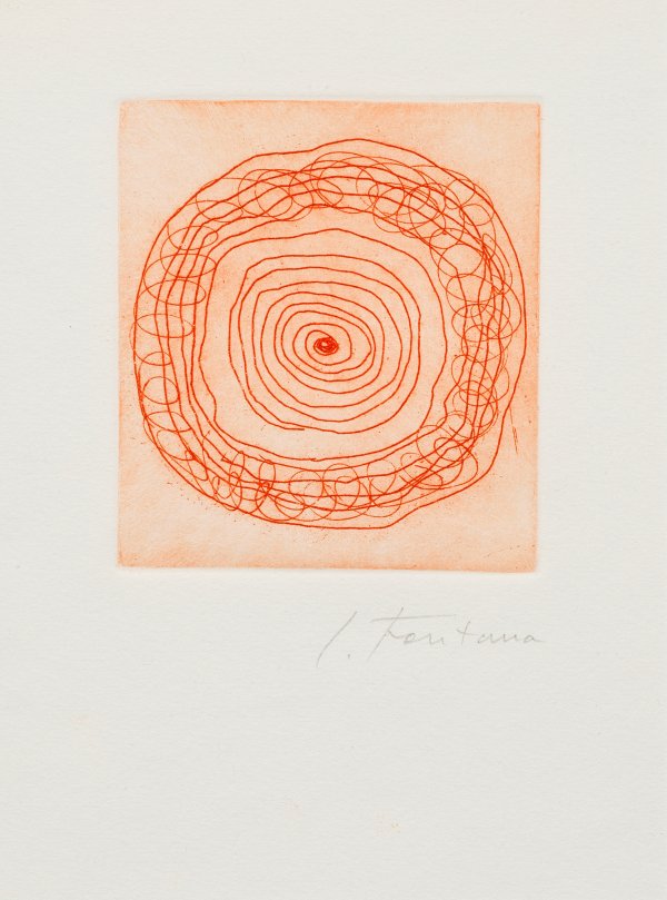 Aquatint in red on wove paper, 1966. Signed. One of an edition of 100 (complete edition of 110). From the artist's book "L'eredità di Dante" by Luigi Cavallo, printed in an edition of 400 numbered from 1 to 400 (plus 40 copies numbered from I to XL). The numbers from 101 to 200 are accompanied by two etchings by Lucio Fontana.