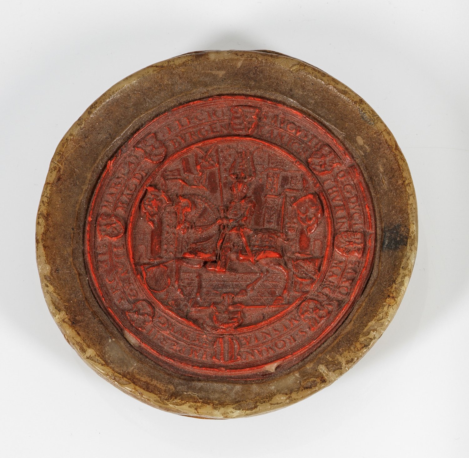 Rotes und naturfarbenes Wachs. Rundes, rotes Wachssiegel mit geharnischtem Ritter zu Pferde vor Hintergrund mit Renaissance-Architektur. Mehrfach mit Profillinien umzogener Rand mit zweizeiliger, lateinischer Inschrift, die sich auf Kurfürst August IV. von Sachsen (1526 Freiberg -1586 Dresden) und seine Herrschaftsgebiete bezieht und acht Wappen, den Text teilw. überlagernd. Gefasst in naturfarbenes Wachs. D. 11 cm.