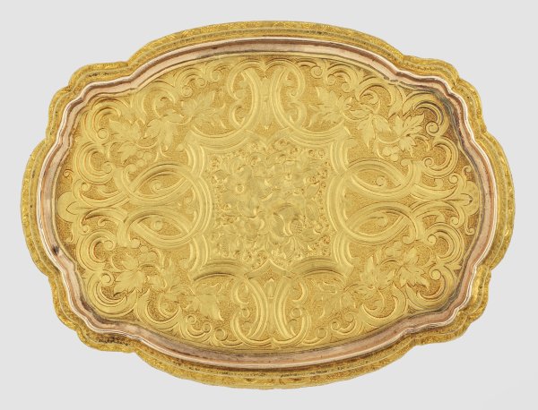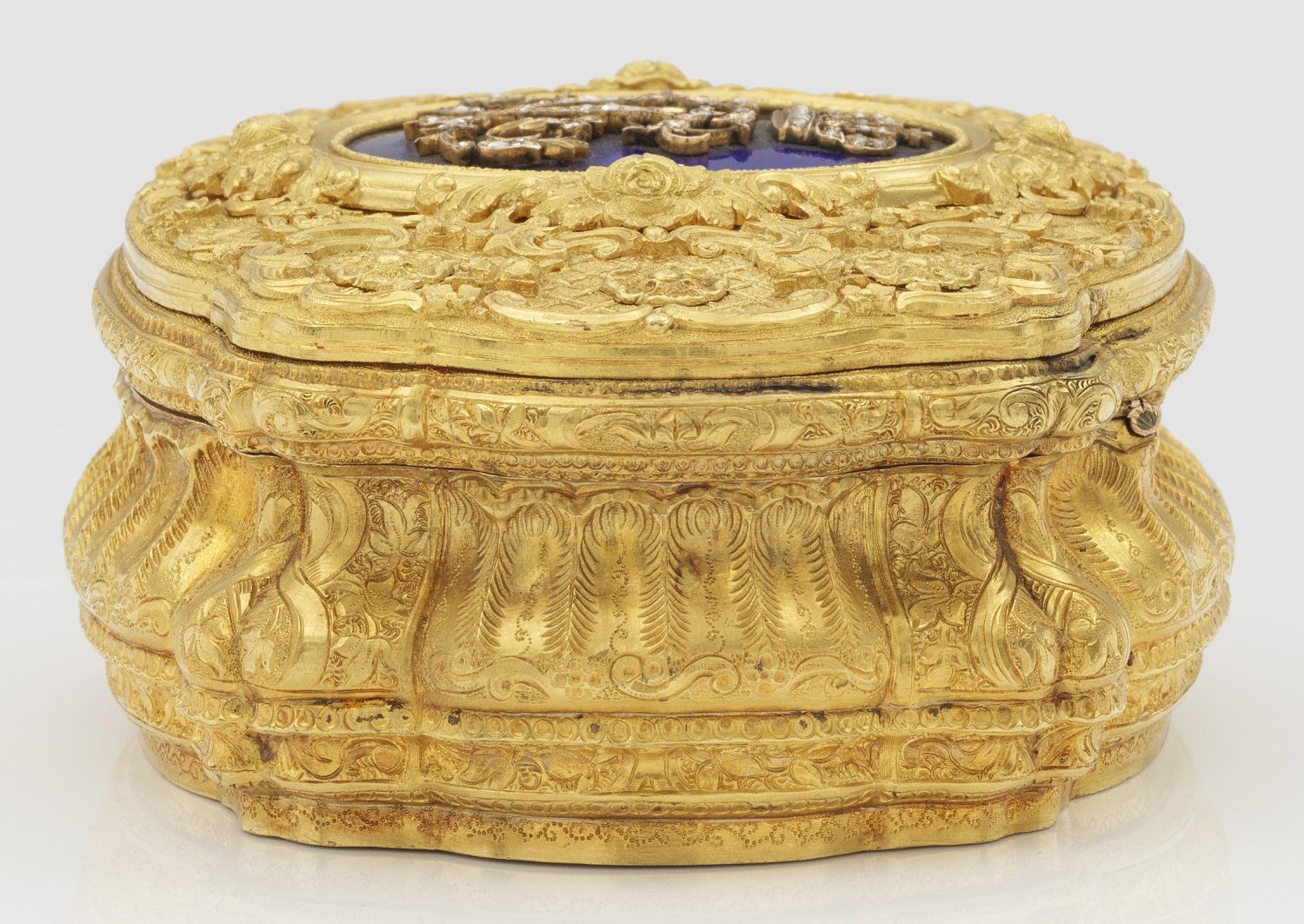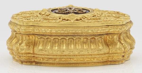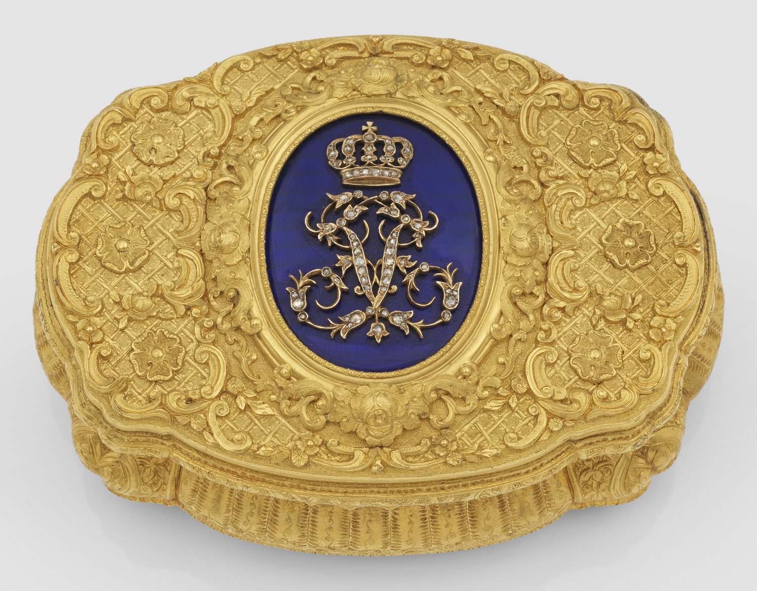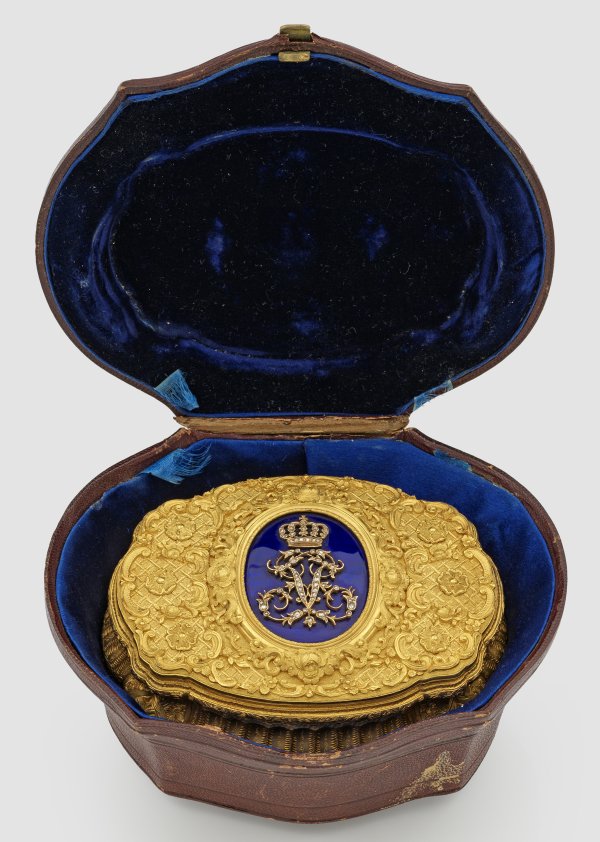 Gelb- und Rotgold, Email. Vierpassige, geschweifte und mehrfach profilierte Kartuschenform. Allseitiger, flächendeckender, reich ziselierter und gravierter Dekor aus erhabenen Voluten, Blütenrosetten und Rocaillen über fein punziertem Gitterwerk. Umlaufend kanneliert und die Eckzwickeln mit Bandel- und Blattwerk. Korrespondierender Boden. Auf dem scharnierten Deckel royalblau emailliertes, hochovales Medaillon mit bekrönter, von Diamantrosen besetzter Chiffre "V" für Sophie Marie Viktoria, spätere Königin von Schweden. Gest. "CMWS", Hofjuweliere Carl Martin Weishaupt und Söhne, Hanau, Feingehaltsmarke für 585er Gold und auf Zarge nummeriert 2548. Gew. ca. 183,68 g. H. 4,1 cm x 9,8 cm x 7,4 cm. Original Lederetui.