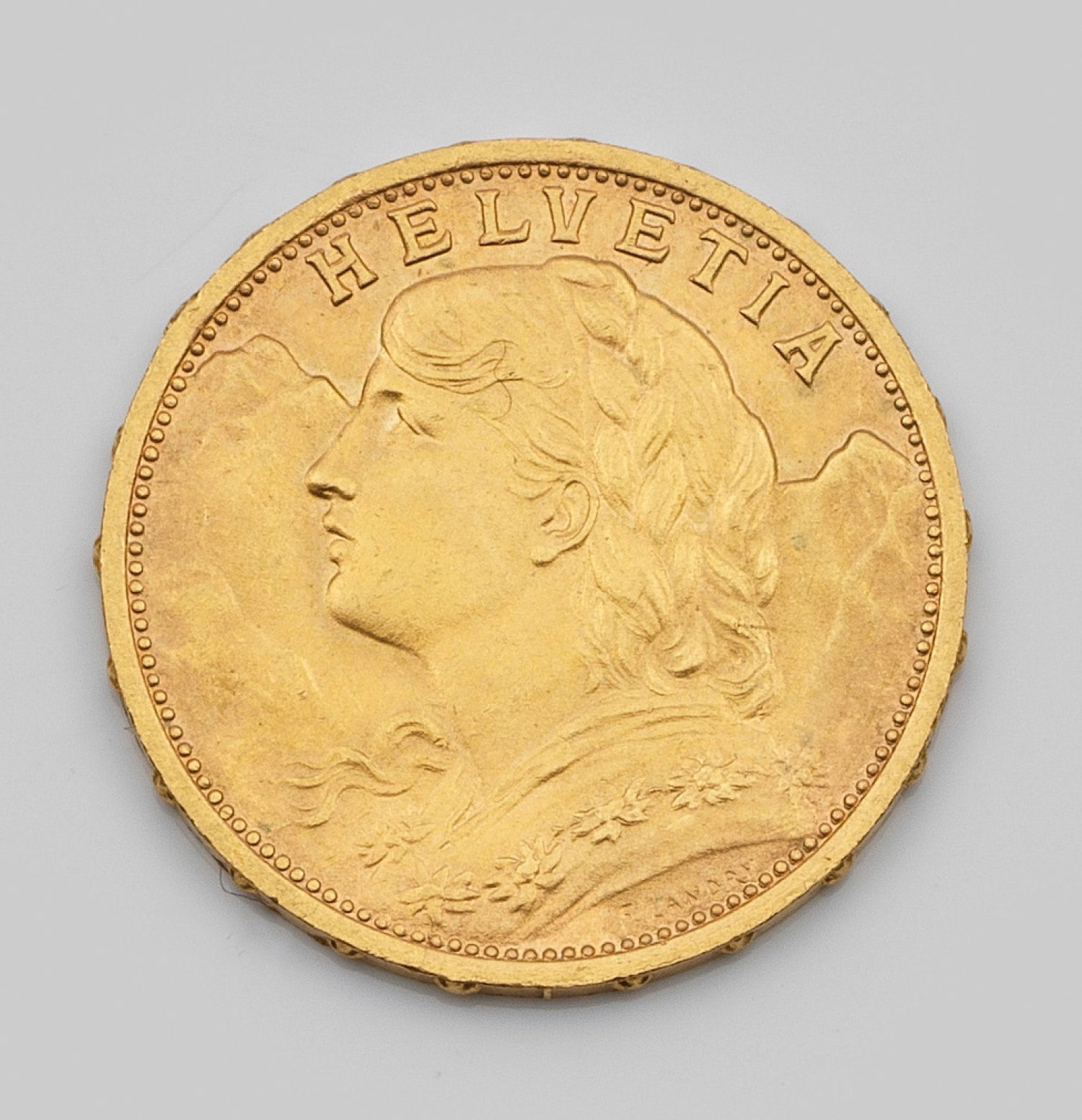 Feingehalt 900. Sog. "Schweizer Goldvreneli". Avers Profilbild einer jungen Frau mit Haarkranz vor einem Alpenpanorama (Entwurf von Fritz Ulysse Landry). Revers Schweizer Wappen mit Eichenzweigen, Nominal, Jahreszahl 1927 und Prägebuchstabe B. D. 21 mm. Gew. ca. 6,46 g.