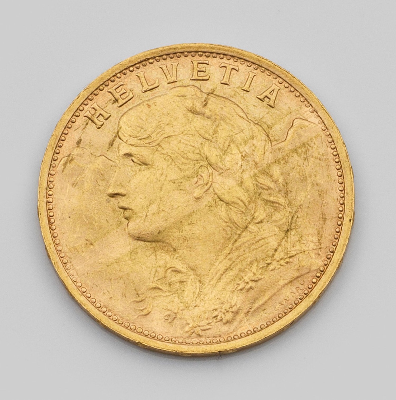 Feingehalt 900. Sog. "Schweizer Goldvreneli". Avers Profilbild einer jungen Frau mit Haarkranz vor einem Alpenpanorama (Entwurf von Fritz Ulysse Landry). Revers Schweizer Wappen mit Eichenzweigen, Nominal, Jahreszahl 1935 und Prägebuchstaben L und B. D. 21 mm. Gew. ca. 6,47 g.