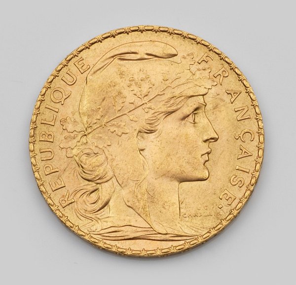 Feingehalt 900. Avers Profilkopf der Marianne, Nationalfigur der Franz. Republik und Symbol der Freiheit und Unabhängigkeit, mit Umschrift "REPUBLIQUE FRANCAISE". Revers der Gallische Hahn als Nationaltier Frankreichs mit Umschrift "LIBERTE EGALITE FRATERNITE", Nominal und Jahreszahl 1908. D. 21 mm. Gew. ca. 6,47 g.