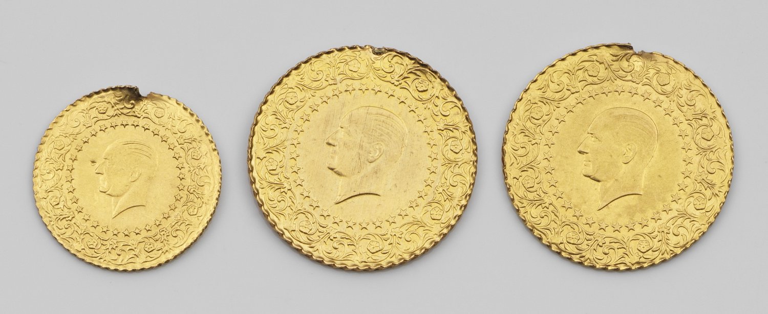 Feingehalt 917. Avers Profilbild von Kemal Atatürk, umrahmt von einem Sternenband und floraler Ornamentbordüre. Revers osmanische Tughra mit Jahreszahlen und korrespondierenden Zierbändern. Dabei: zwei 50 Piaster-Münzen (2011 und 2013) sowie eine 25-Piaster-Münze (2006). D. 18 bzw. 22 mm. Ges.-Gew. ca. 8,75 g.