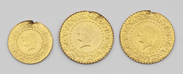 Three turkish piaster coins in 22 k gold.