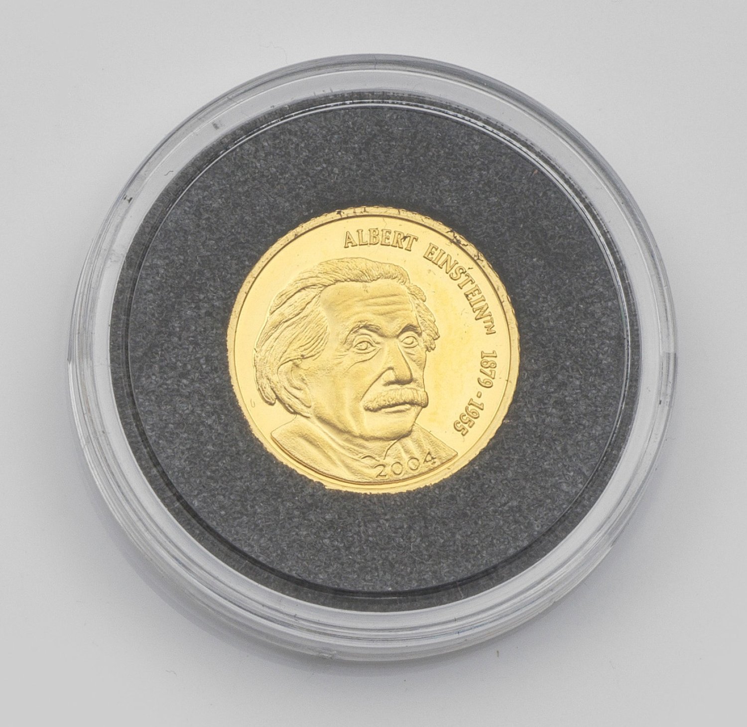 Feingold 999. Aus der Serie "Die kleinsten Goldmünzen der Welt". Avers der Porträtkopf von Albert Einstein mit Umschrift "ALBERT EINSTEIN 1879-1955" sowie Jahreszahl 2004. Revers Staatswappen über Adler mit Umschrift "COMMONWEALTH OF THE NORTHERN MARIANA ISLANDS"und Nominal. D. 14 mm. Gew. ca. 1,23 g.