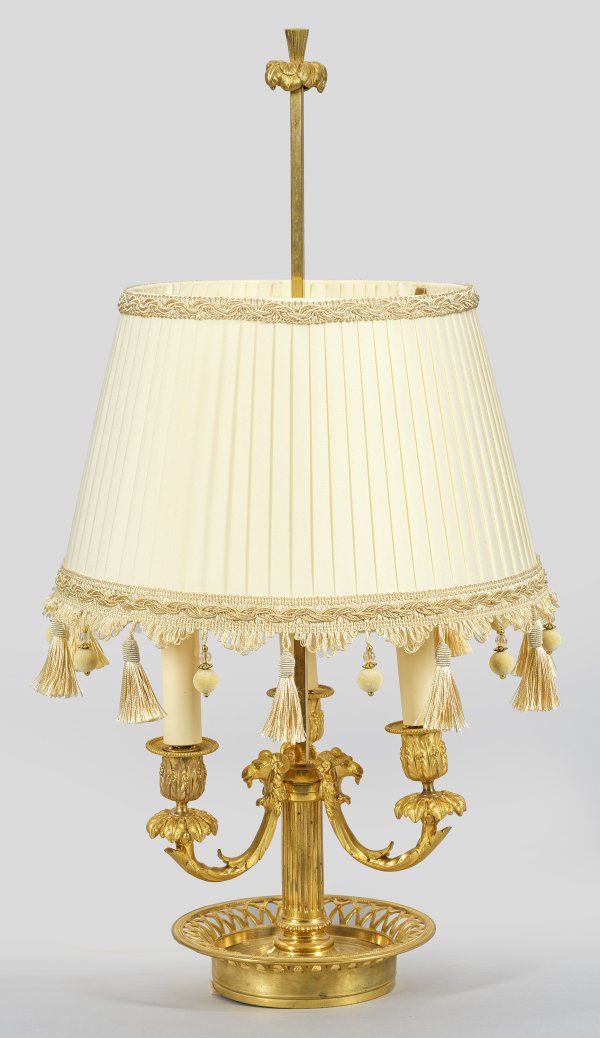 3-flg.; Bronze, vergoldet. Über schalenförmigem, gitterartig durchbrochenem Rundfuß kannelierter Balusterschaft. Davon ausgehend geschwungene Leuchterarme mit plastischen Widderköpfen und vasenförmigen Tüllen mit Lorbeerblatt. Oberhalb schlanker Schaft als Träger für höhenverstellbaren Lampenschirm. Elektrifiziert. H. 66,5 cm.