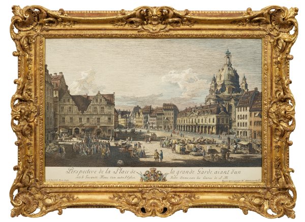 Holz, stuckiert, gefasst und vergoldet. Rechteckige, umlaufend profilierte und tief gekehlte Rahmung mit reliefplastischen Muschelmotiven und durchbrochen gearbeiteten Blattranken. Glasscheibe sowie Druck mit einer Dresdenansicht nach Canaletto. 75 cm x 100 cm. Falzmaß 55 cm x 80,7 cm.