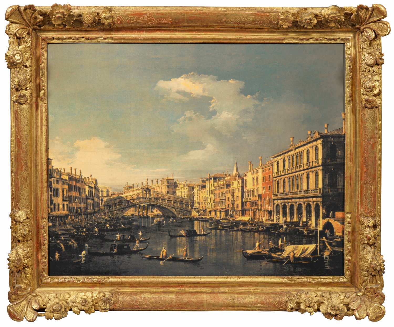 Holz, stuckiert, gefasst und vergoldet. Rechteckige, umlaufend profilierte Rahmung, in den Ecken mit reichem Dekor aus reliefplastischen Blüten. Innen Druck einer Venedig-Vedute. H. 84,5 cm. 100 cm. Falzmaß 82,5 cm x 66 cm.