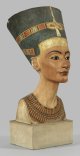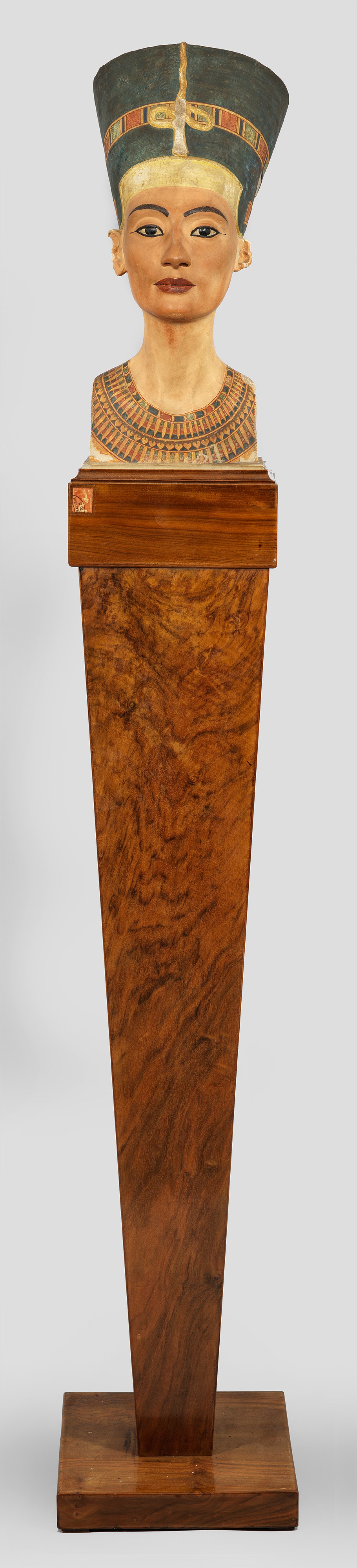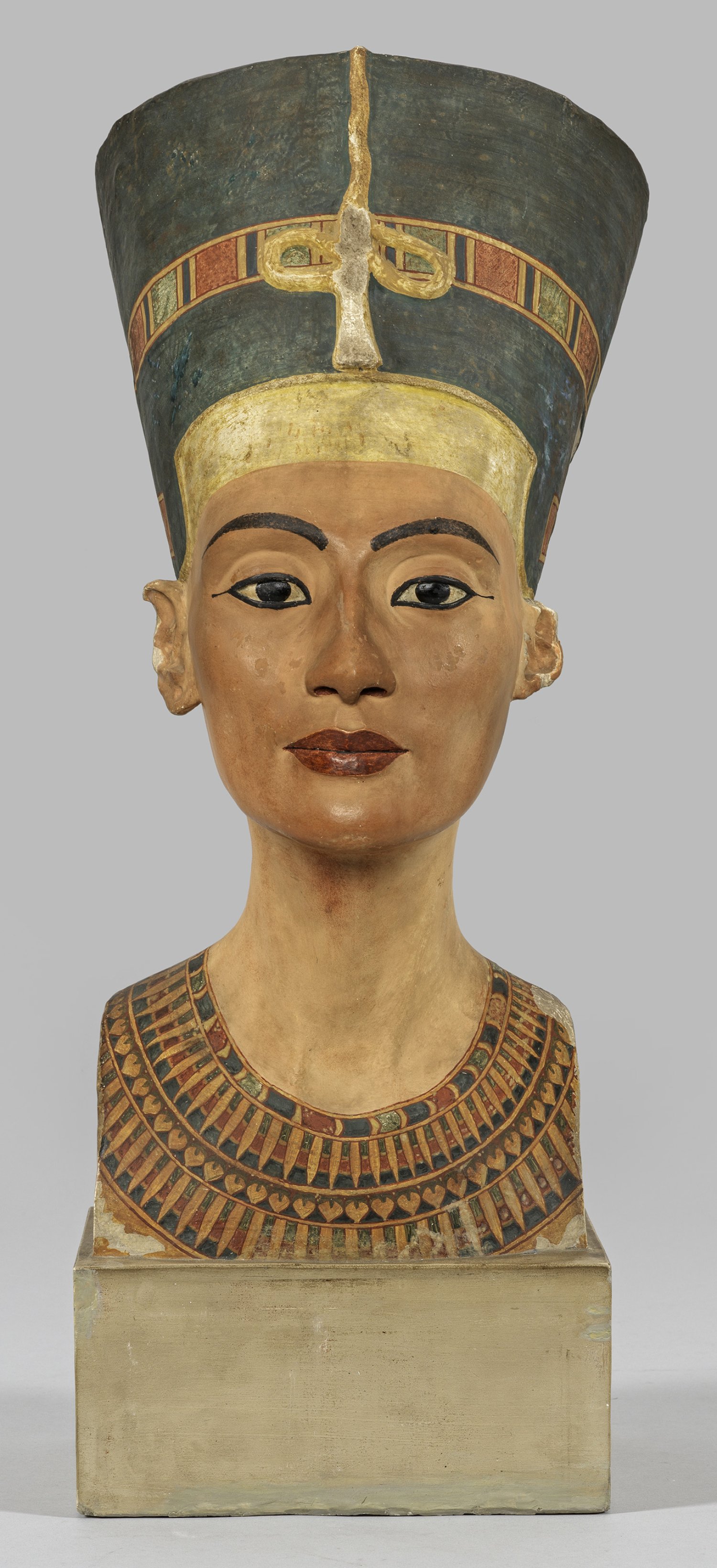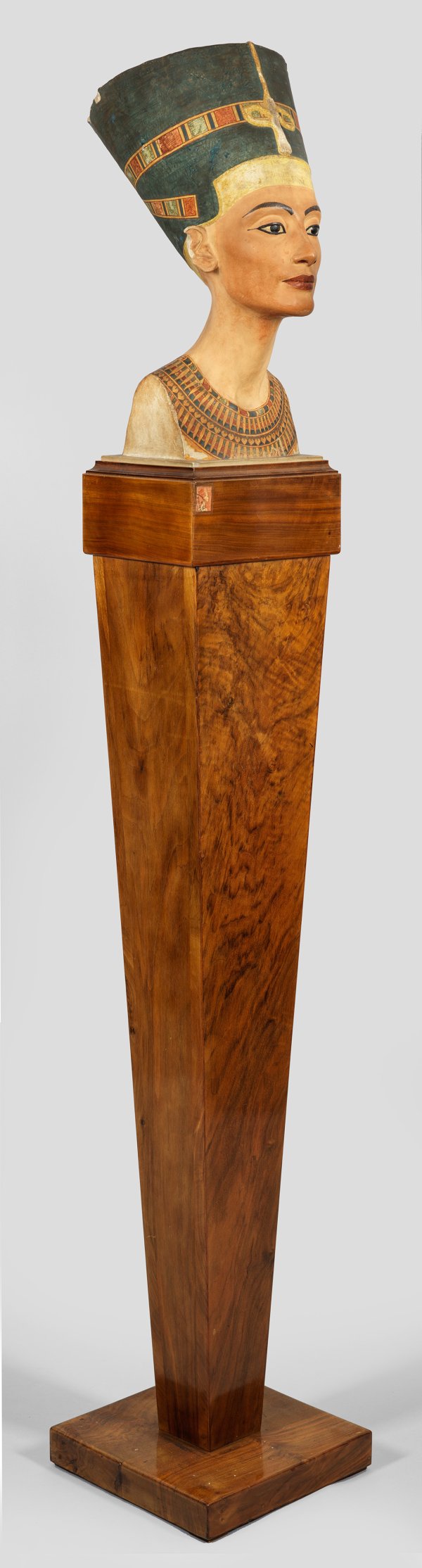 Gips, polychrom bemalt. Frühe Ausformung in einem Stück zusammen mit der rechteckigen Plinthe, um 1922-um1930. Verso eingeritzte Modell-Nr. "539" der Staatlichen Gipsformerei Berlin. Eigens angefertigter, hoher Pfeilersockel aus Nussbaum. Bei der vorliegenden Version hat Nofretete im Unterschied zum Original zwei Augen und eine Plinthe, während die anderen Beschädigungen des Originals (am linken Ohr und an der Krone) wiedergegeben wurden. Die Büste der Nofretete zählt nicht nur wegen ihrer zeitlosen Schönheit und ihrer feinen Gesichtszüge zu den bekanntesten Kunstschätzen des Alten Ägypten und gilt als Meisterwerk der Bildhauerkunst der Amarna-Zeit, angefertigt in der Regierungszeit des Königs (Pharaos) Echnaton zur Zeit der 18. Dynastie (Neues Reich) zwischen 1353 und 1336 v. Chr. Die Büste wurde am 6. Dezember 1912 bei Ausgrabungen unter Leitung von Ludwig Borchardt in Tell el-Amarna in der Werkstatt des Oberbildhauers Thutmosis entdeckt und 1913 nach Deutschland gebracht. 1920 ging die Büste der Nofretete durch eine Schenkung von James Simon an den preußischen Staat; 1924 erfolgte die erste öffentliche Präsentation der Büste im für die ägyptische Sammlung der Staatlichen Museen zu Berlin errichteten Museum auf der Berliner Museumsinsel, seitdem ist das Kunstwerk bis heute eine Dauersensation und ein Star. Doch bereits vor 1924 gab es erste Gipsabgüsse: 1913/14 schuf die Bildhauerin Tina Haim-Wentscher (1887 - 1974) zwei bemalte Nachbildungen in Kunststein für James Simon und Kaiser Wilhelm II.; 1921 folgte dann das Urmodell der Bildhauerin mit zwei bemalten Augen für die Staatliche Gipsformerei in Berlin, bis Ende 1922 waren schon 75 Exemplare der Nachbildung ausgeführt. Büsten-H. 60,5 cm; Sockel-H. 135 cm.