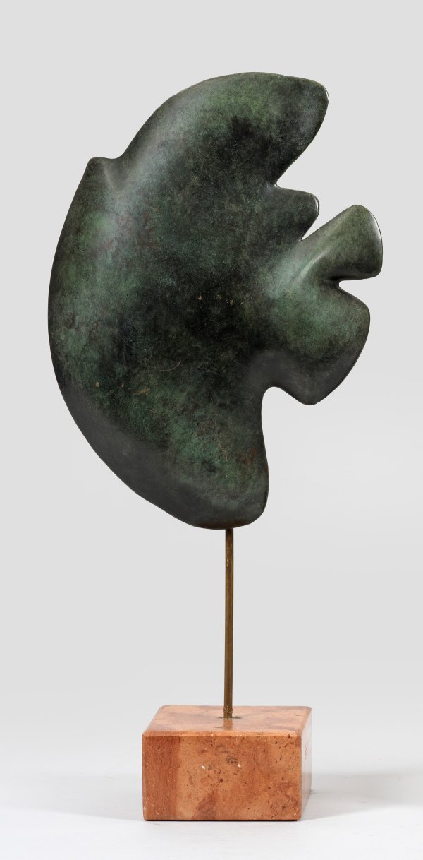 Bronze, in dunklen bzw. grünen Tönen patiniert, roséfarbener Marmorsockel. Sign. u. nummeriert 1/2. Weich-fließende, biomorphe, flache Form, inspiriert durch Hans Arp, montiert auf einem Stab und quadratischem Sockel. Peschke, der bei Gerhard Gollwitzer an der Stuttgarter Akademie lernte, ließ sich mit 35 Jahren als freier Künstler zunächst in Spanien nieder; später wurde er in Meran bzw. Bozen, Bruckmühl und Flintsbach ansässig. Auf zahlreichen Ausstellungen im In- und Ausland war Peschke seit Mitte der 1990er Jahre vertreten. Ges.-H. 51,8 cm.