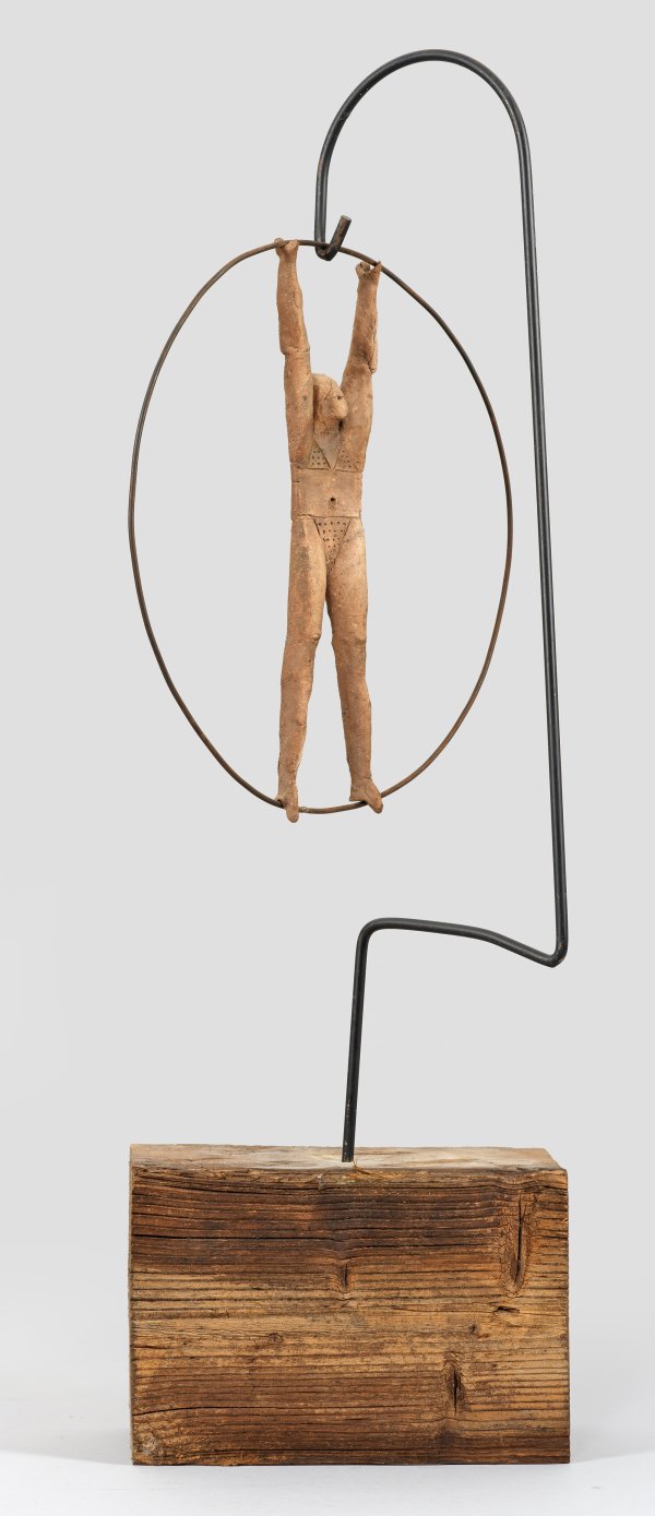 Figur aus schamottierter Keramik, Kreisring und die Aufhängung aus Stahldraht, Sockel aus braun gebeiztem Nadelholz. Fischer gehörte zu den bedeutendsten zeitgenössischen Bildhauern nach 1945, wobei er vornehmlich abstrahierte menschliche Figuren sowie Reiter und Pferde darstellte, bevorzugt in Keramik. Daneben umfasst sein plastisches Oeuvre Werke in Bronze, Eisen sowie anderen Materialien. Er studierte 1953-1958 Bildhauerei an der Münchener Akademie bei Heinrich Kirchner und hatte Kontakt zu Toni Stadler. Zusammen mit den Studienkollegen und Malern Heimrad Prem, Helmut Sturm und Hans Peter Zimmer gründete er 1957 die Künstlergruppe "SPUR". 1959 erhielt Fischer das renommierte Stipendium der Villa Massimo, Rom, 1964 nahm Fischer an der "documenta III" in Kassel teil. 1975-1997 lehrte Fischer als Professor an der Universität der Künste. 2004 eröffnete das ihm gewidmete das Museum Lothar Fischer in Neumarkt in der Oberpfalz. Ges.-H. 71 cm.