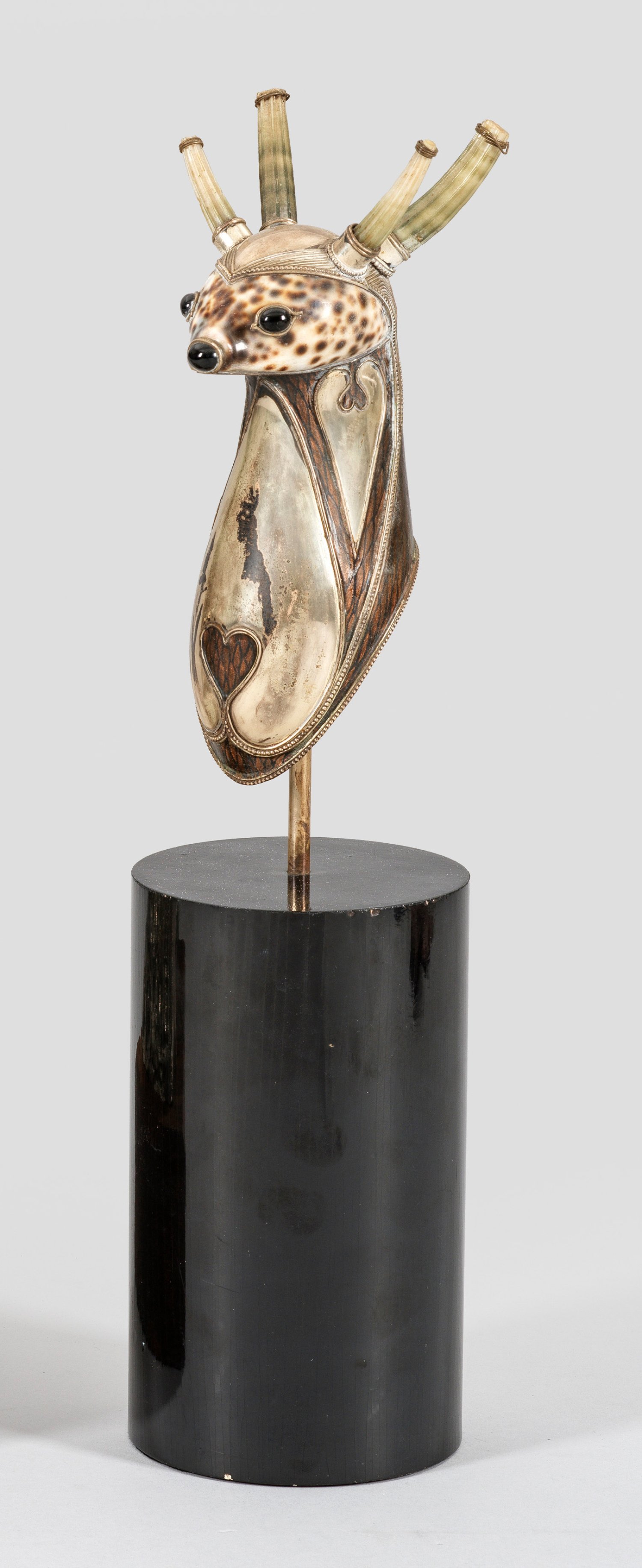 Mixed Media, der Kopf aus einer Kauri-Schnecke, Hals und Kopf teilw. aus versilbertem und bemaltem Metall, montiert mittels eines Stabes auf einem schwarzen, glänzend lackiertem Holzsockel. Sign.; 1968 stellte Estevez an der Seite von Salvador Dalí aus, der sein Förderer wurde. Anfang der 1970er Jahre ließ er sich in New York nieder, wo er den Designer Karl Springer (1931- 1991) kennenlernte, der sein Lebenspartner wurde und mit dem er auch zusammenarbeitete, da seine Objekte gut zu den eleganten Interieurs und Möbeln Springer passten. Zudem arbeitete Estevez seit 1979 für Cartier. Estevez spezialisierte sich auf stilisierte Tierskulpturen und menschlichen Figuren aus verschiedensten Materialien, die er auch kombinierte, wie Carrara-Marmor, Fiberglas, Bronze, Perlmutter und Emaille. Er stellte seine Arbeiten in Buenos Aires, New York und Palm Beach aus. H. 38,5 cm.