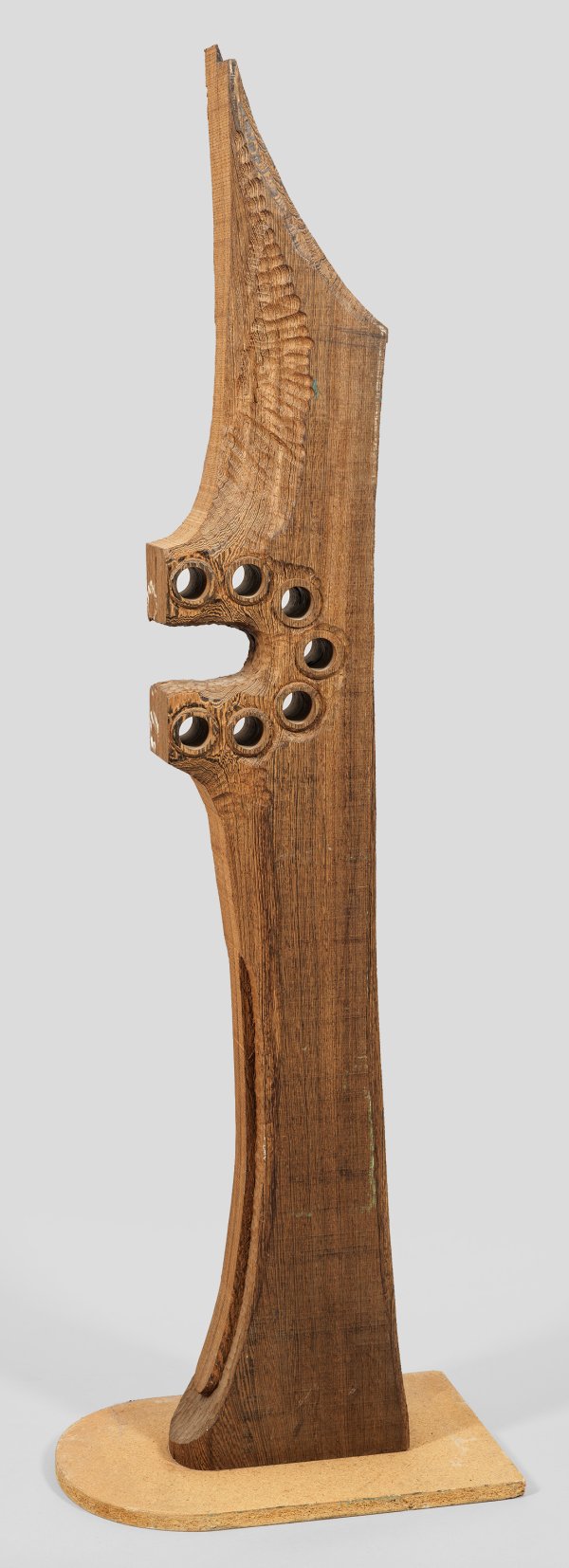 Oakwood sculpture on flakeboard base.