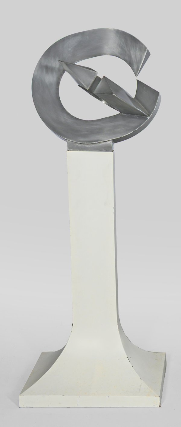 Aluminium, teilw. gebürstet; weiß lackiertes Holz. Monogr. u. dat. "ER (19)89". Auf einem rechteckigen, sich turmartig verjüngenden Pfeilersockel komponierte Skulptur aus zwei miteinander verbundenen Ringspangen mit dreieckigem Querschnitt. Raidt griff bei dieser Raumskulptur Ideen der Kinetischen Kunst auf, wobei hier das variierende Licht auf dem glänzenden Metall und der sich dynamisch im Raum bewegende Betrachter wesentlich sind. Der Bildhauer studierte an der Staatl. Akademie der Bildenden Künste in Stuttgart; danach lebte und arbeitete er ebenda sowie in verschiedenen Städten, vorwiegend in Baden-Württemberg. Ges.-H. ca. 134 cm.